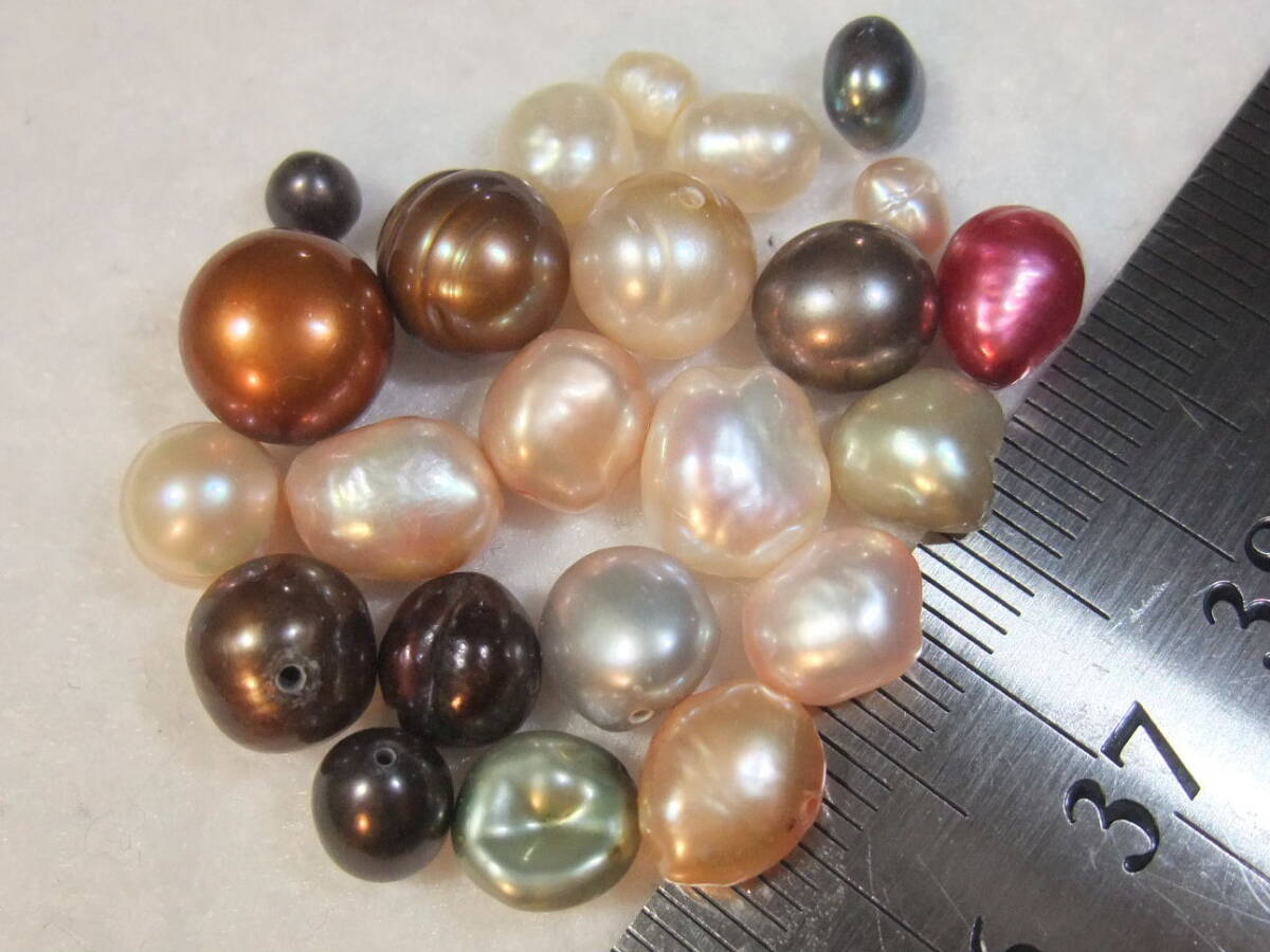 人気の上質なカラートリートメントをされたパールをメインにナチュラルカラーのも混ぜ、サイズも状態もシェイプも穴あけも色々混じった、淡水真珠の使いやすいアソートセットになります!ほぼ両穴ルースです。