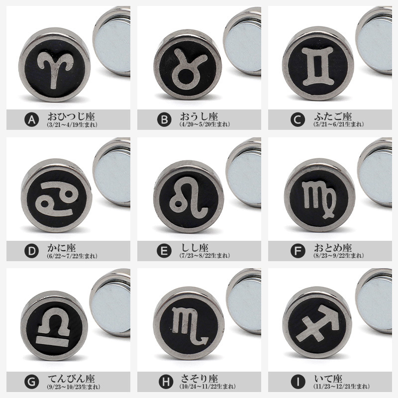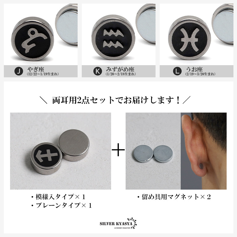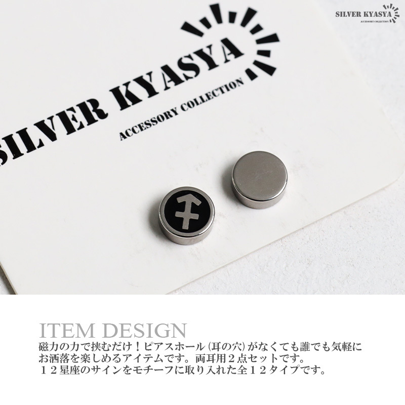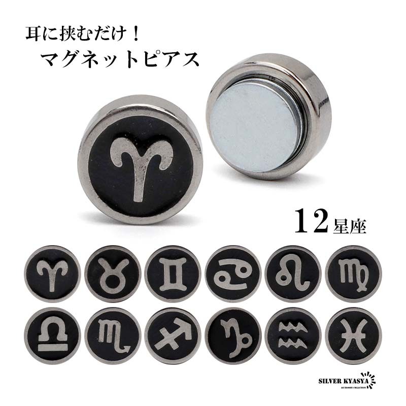 ピアスホールが無くても使えるマグネットピアス。本体と付属のマグネットで耳に挟むだけで装着できます。12星座のサインのマークを選べます。自分の誕生月のものやプレゼントにもオススメです。