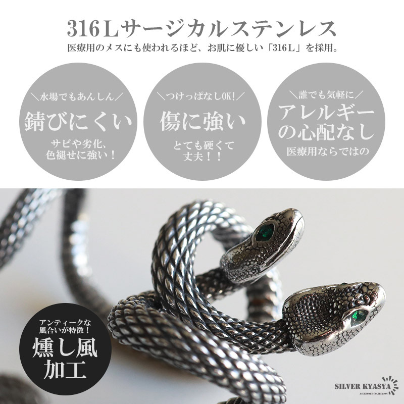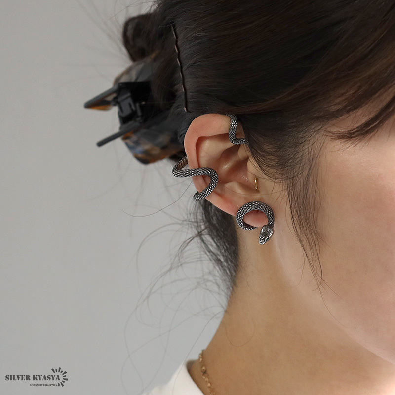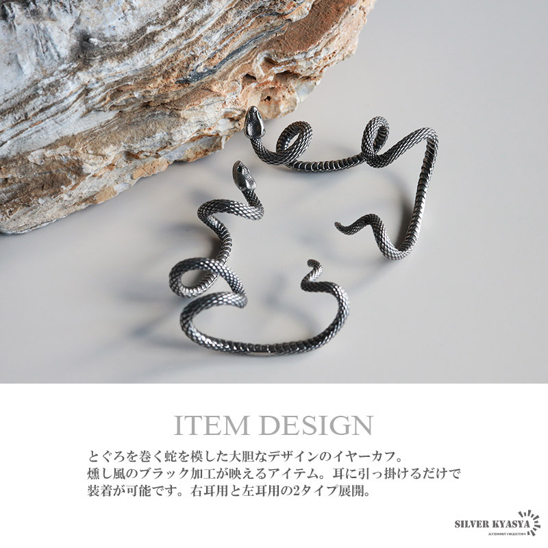 | 商品概要 | ■ITEM DETAIL とぐろを巻く蛇を模した大胆なデザインのイヤーカフ。燻し風のブラック加工が映えるアイテム。耳に引っ掛けるだけで装着が可能です。右耳用と左耳用の2タイプ展開。 ■316Lサージカルステンレス素材を使用 金属部分は医療用としても知られる316Lサージカルステンレスを採用。耐久性はもちろん耐水性も高く水場での着用も可能。ステンレスの中でも極めてアレルギーを引き起こしにくく、安心して使用できます。 |