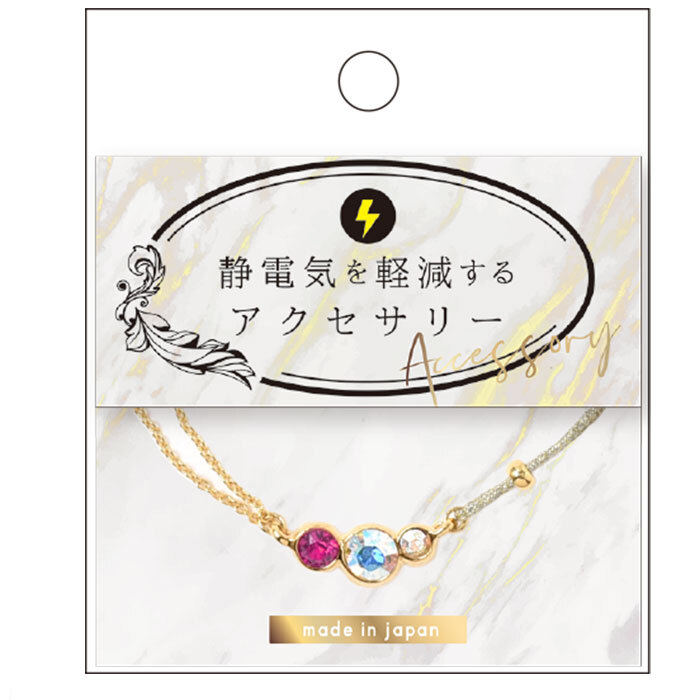 | 商品説明 | ・・アクセサリー感覚で使える、静電気を除電し続けるチャームブレスレット。 ・バチッとくるイヤ~な静電気も、これを身につけていれば大丈夫! ・ゴールドカラーの紐に、業務用でも使用している高い静電気除去能力のあるステンレス糸が編み込んであり、肌と繊維が触れた箇所から体内に溜まった静電気を放電。 ・職人が一つひとつ手作りしている、全て日本製のハンドメイド商品。 ・サイズ調整可能なアジャスター付き。 ・華奢な女性らしいELEBLOのブレスは、アクセサリー感覚で使うことができる。単体で付けたり、時計や他のアクセサリーと重ね付けもOK。 ・キラキラのストーンやパール調のポイントがゴージャスなチェーン型チャームなど、上品でキュートなデザイン。 ・※本製品は静電気を完全に除去するものではありません。 ・※静電気の軽減効果は、環境条件や使用状況により個人差があります。 |