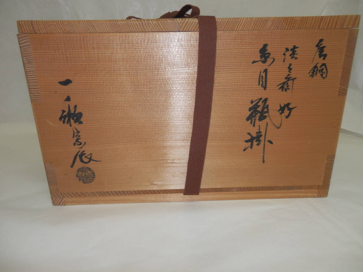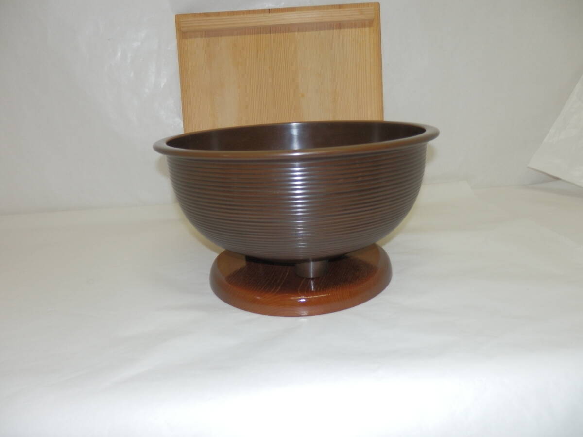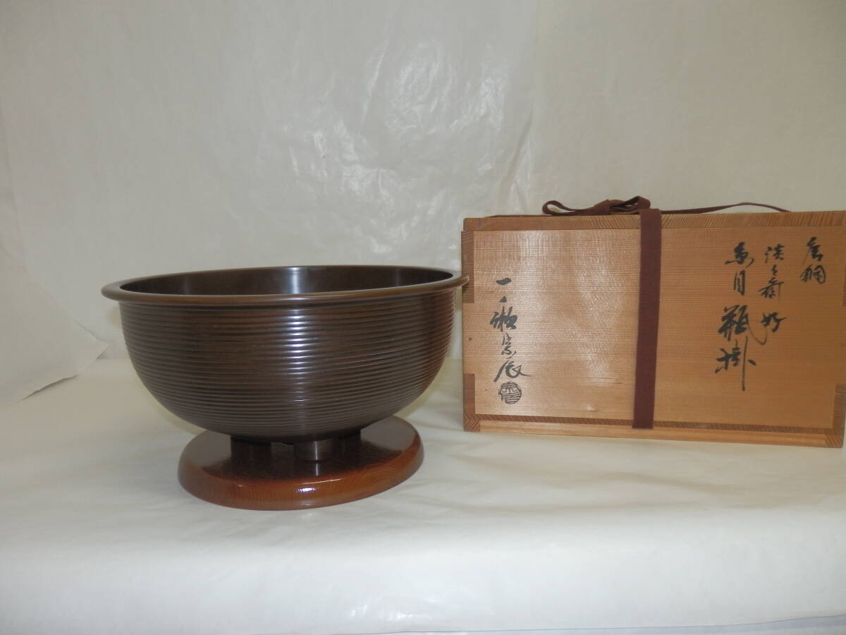 「中古品・茶道具」高岡の金工師の一ノ瀬宗辰さんの唐銅製の瓶掛です。裏千家の淡々宗匠の御好写です。径約31.5cm 高さ約17.3cm 底に宗辰の小判の刻印有。 共箱「ヤケ、シミ等有」。 どうぞ宜しく。
