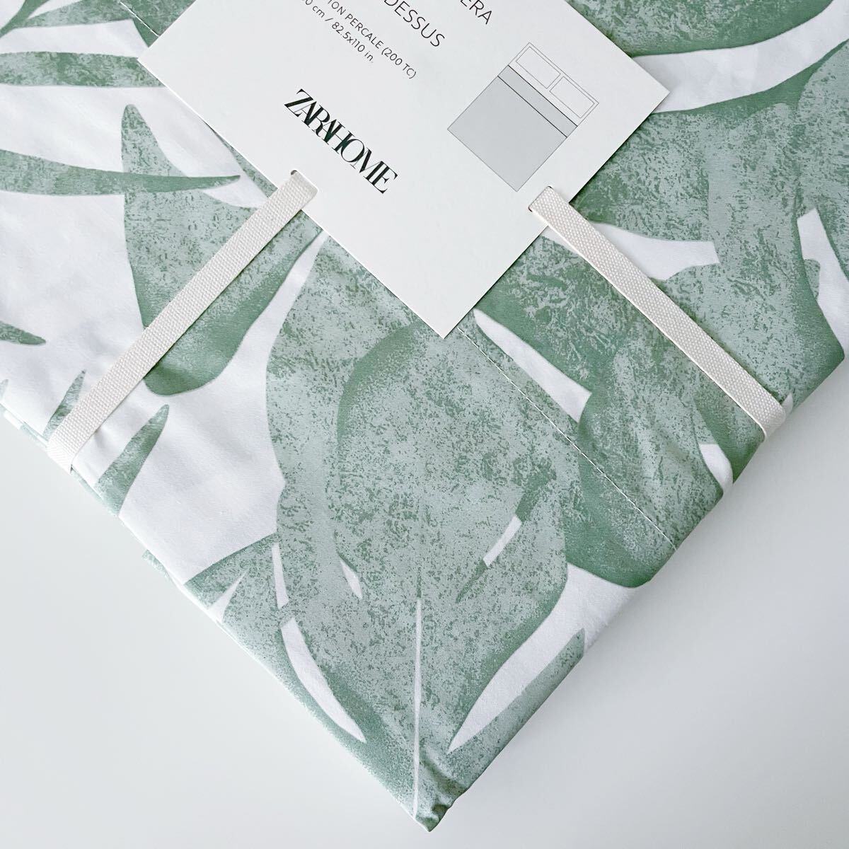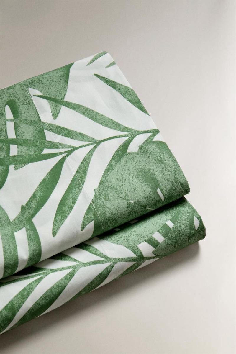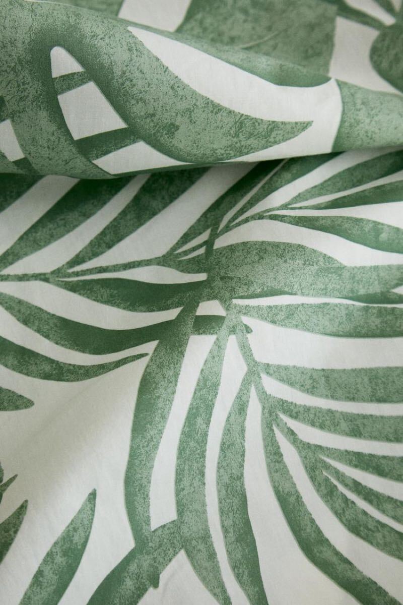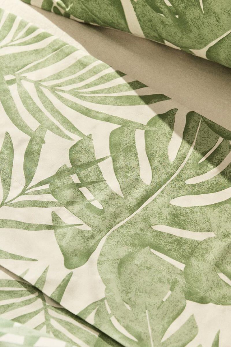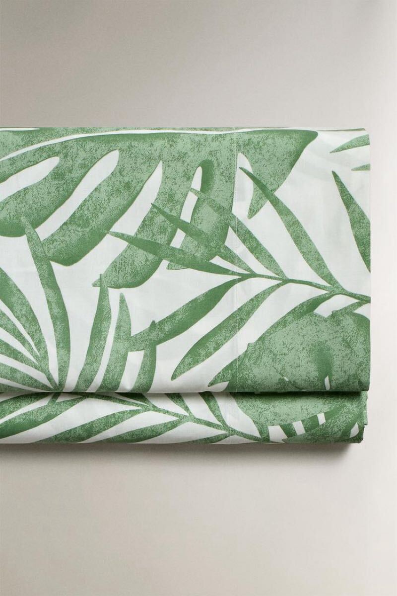 コットンパーケル素材のフラットシーツ、スレッドカウント200、トロピカルリーフ柄