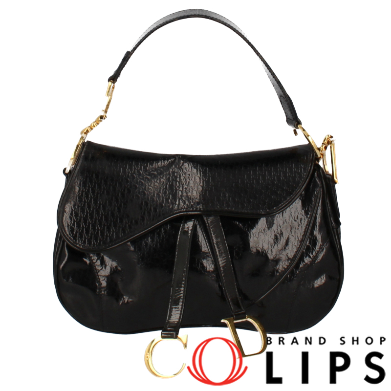 ディオール トロッター ダブルサドルバッグ エナメル レディース ショルダーバッグ ブラック 美品 中古