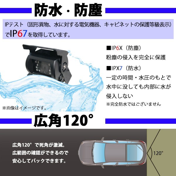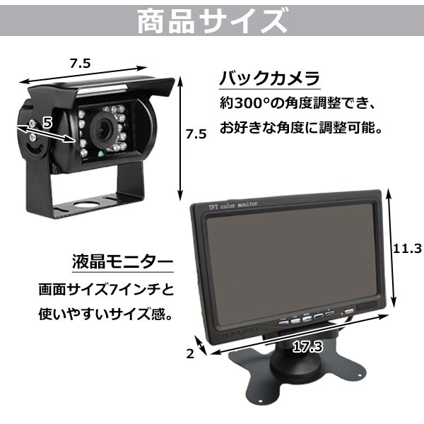 | 商品説明 | 【おすすめポイント】 ・バックカメラ1台と7インチモニターのセットです。 ・モニターと有線で直接繋ぐ為、通信状況に影響を受けにくく電波の弱い場所でも使用することができます。 ・約20mケーブルが付属しており余裕をもって配線可能です。 ◆バックカメラ◆ ・トラックにも対応できる24V対応のバックカメラです。 ・12V車、24V車どちらでもお使いいただけます。 ・広角120℃で幅広く後方を確認でき、車庫入れ等をサポートします。 ・赤外線LEDライト付きなので、暗い場所でも赤外線照射により視界を確保いたします。 ・明るさに応じた自動切替タイプなので、切替の手間が省けます。※暗視モード時のみ白黒映像 ・安心の防水・防塵(IP67)加工済です。※完全防水ではございません。 ・ガイドラインの表示が可能なので、駐車の時に便利です。 ・角度調整可能なので、お好きな角度に調整して取付ができます。 ◆モニター◆ ・高画質なTFT液晶モニターです。 ・バックギアを入れると自動的にバックカメラ映像に切り替わります。 ・鏡像モードと正像モードがモニター設定で切替可能です。 ・オンダッシュ固定スタンド付きです。 ・リモコン付きで簡単に遠隔操作ができます。 【商品詳細】 ◆バックカメラ◆ ・本体サイズ:約7.5×5×7.5(cm) ・ナイトビジョン:自動ゲイン制御、自動ホワイトバランス、自動逆光補正 ・有効画素数:1280×720P ・レンズ広角:120度 ・LED:18個 ・防水/防埃:IP67 ・動作電源:DC12V/2A ・最大電力:3W ◆モニター◆ ・液晶サイズ:7.0インチ ・表示モード :16:9(4:3) ・画面有効画素数:1024*600 ・映像システム:PAL/NTSC ・本体サイズ:約17.3x 11.3 x 2(cm) ・重量:約254g ・電源:DC12V-24V ・消費電力:6W ・スタンド:約9×12(cm) ※こちらの商品は「音声出力」はございません。ご了承ください。 関連キーワード:バックカメラモニターセット カメラ モニタセット 有線 7inch 12V/24V 上下 左右 反転 20m 広角120° 赤外線照射 IP67 角度調整 赤外線LEDライト 車庫入れ 鏡像モード 正像モード 高画質 TFT液晶モニター リモコン付き LED 18個 軽自動車 自動車 普通車 重機 大型 小型 バス キャンピングカー バックモニター 自動切換 駐車 縦列駐車 バック 運転 ドライブ 安全 対策 いすゞ エルフ スズキキャリイ スバルサンバーオープンデッキ サンバートラック ダイハツグランマックストラック デルタトラック ハイゼットデッキバン ハイゼットトラック ハイゼットピック トヨタダイナ ダイナハイブリッド タウンエーストラック トヨエース トヨエースハイブリッド ハイエーストラック ピクシストラック ライトエーストラック ホンダ アクティトラック マツダ スクラムトラック タイタン タイタンダッシュ ボンゴトラック ボンゴブローニイトラック 三菱 デリカトラック ミニキャブトラック ミニキャブミーブトラック 三菱ふそうキャンターEX キャンターエコハイブリッド キャンターガッツ 日産 NT100クリッパー NT450アトラス アトラス クリッパートラック コンドル バネットトラック 日野自動車 デュトロ デュトロハイブリッド ※車種・自動車メーカーはあくまで参考車種になりますので、よく仕様・長さ等ご確認の上ご注文下さいませ。 |