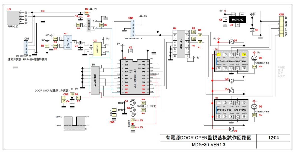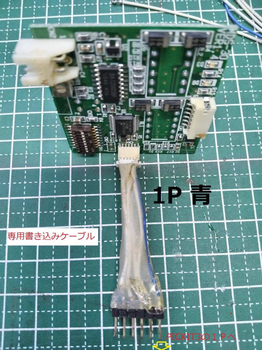 書き込み専用アダプターは青色が1ピンです。 6ピンの青線側をPICKIT3の1ピン側に挿入 電源は6V以上赤色が+、黄線が-です。 その他は 接点出力用 3-4,5-6が対に U3 MCP1702-5002E/CB 入力電圧-最小:2.7 V 入力電圧-最大:13.2 V 出力電圧:5 V