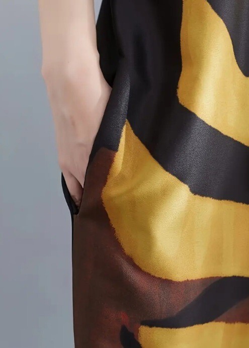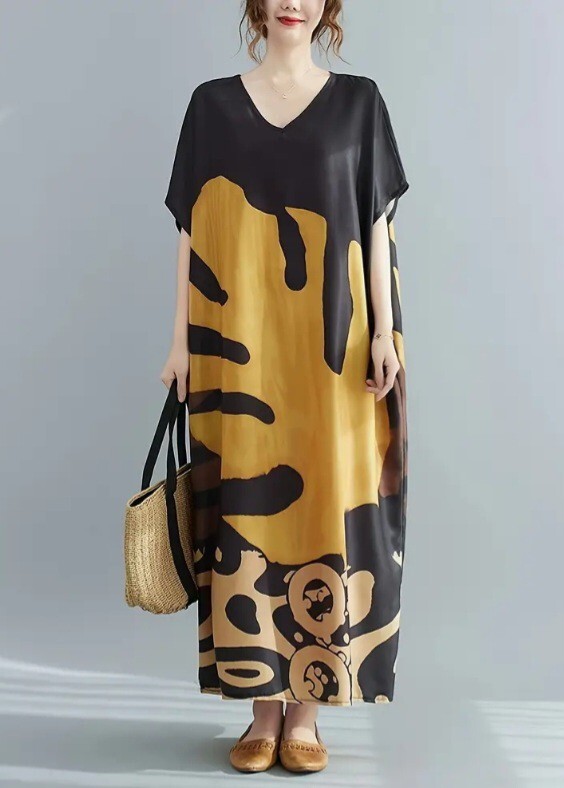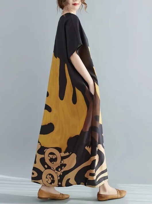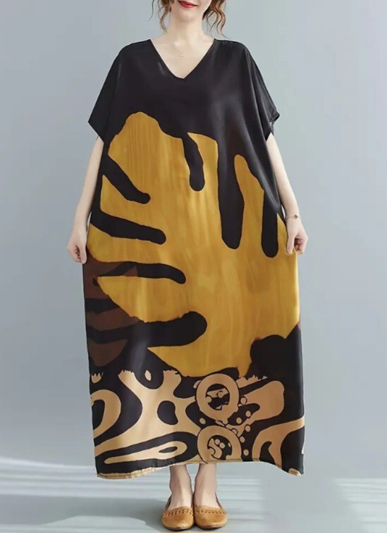 黒と金の抽象的なデザインのVネックロングワンピース、軽量でゆったりとしたシルエット。