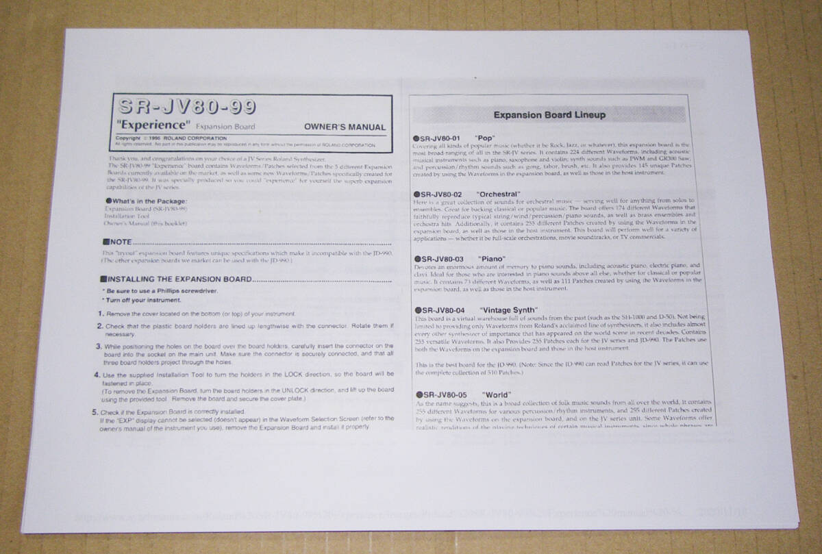 ★商品説明★ ■Roland SR-JV80-99 EXPERIENCE EXPANSIONの出品です。 ◆使えるモデル:JV-80,JV-90,JV-1000,XP-30,XP-50,XP-60,XP-80,JV-880,JD-990,JV-1010,JV-1080,JV-2080,FANTOM FA76,XV-88,XV-3080,XV-5080。 ◇タバコ臭/ペット臭/ベトベト:無し。 ■動作確認しております。製品の方は問題なく動作しておりましたが、あくまでも中古扱いとさせて頂きます。 ★支払方法★ Yahooかんたん決済のみ。決済手続き確認後の発送となります。 ★注意事項★ ノークレーム・ノーリターンでお願い致します。※土日曜・祝日は発送できません。予めご了承下さい。 ★発送詳細★ 恐れ入りますが、振り込み手数料と送料は落札者様のご負担でお願いします。送料は185円です。 |