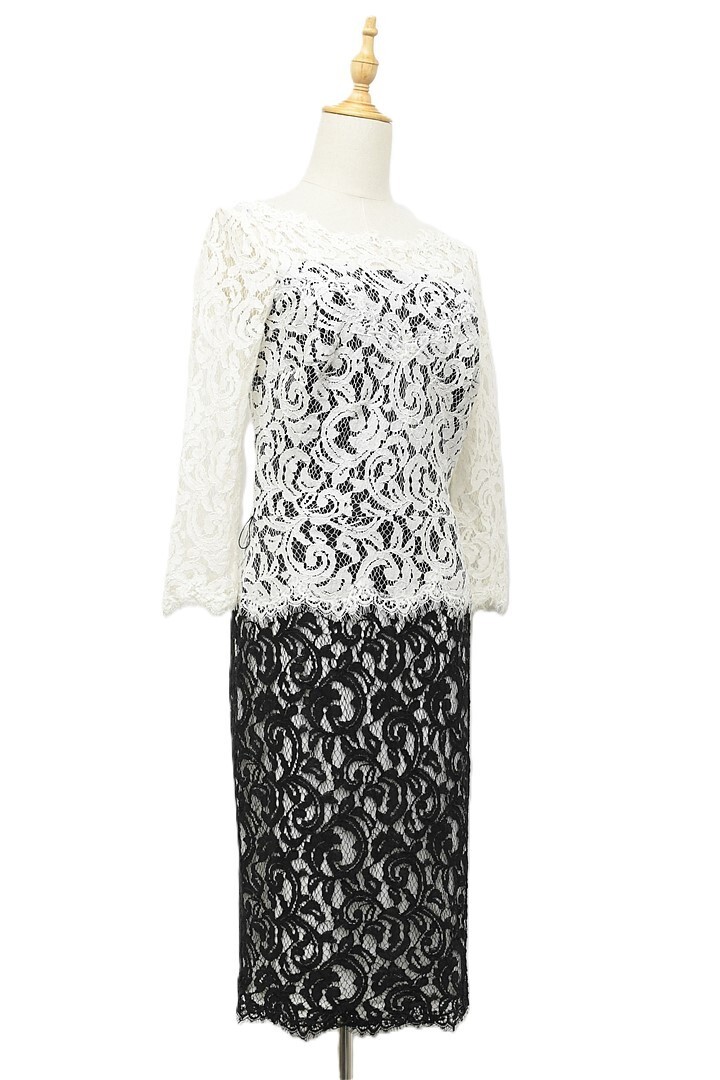 W137/USA製 TADASHI SHOJI タダシショージ ドレス ひざ丈ワンピース 総レース 総柄 ウエストベルト リボン シースルー 長袖 4 S~M 白 黒