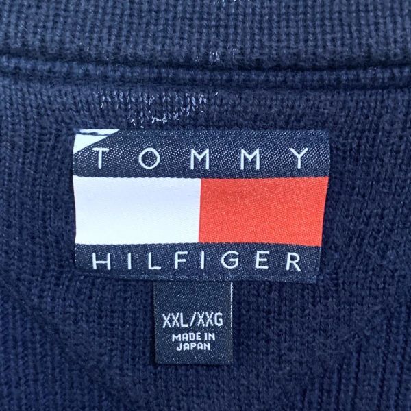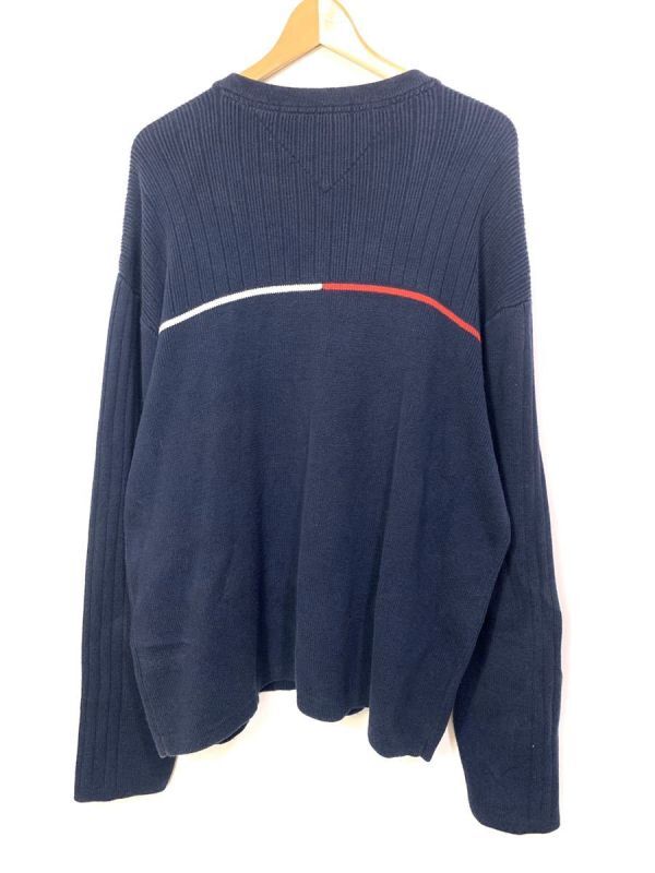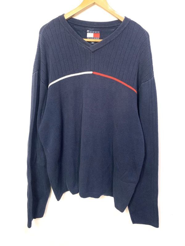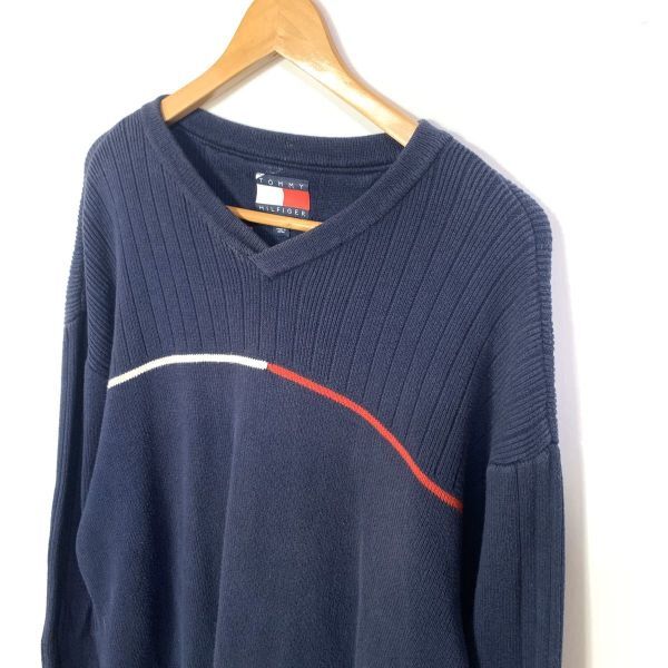 ■オーバーサイズ TOMMY HILFIGER トミーヒルフィガー 浅Vネック 針抜き切り替えし ロゴライン コットンニットセーター 古着 アメカジ■