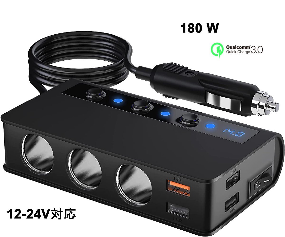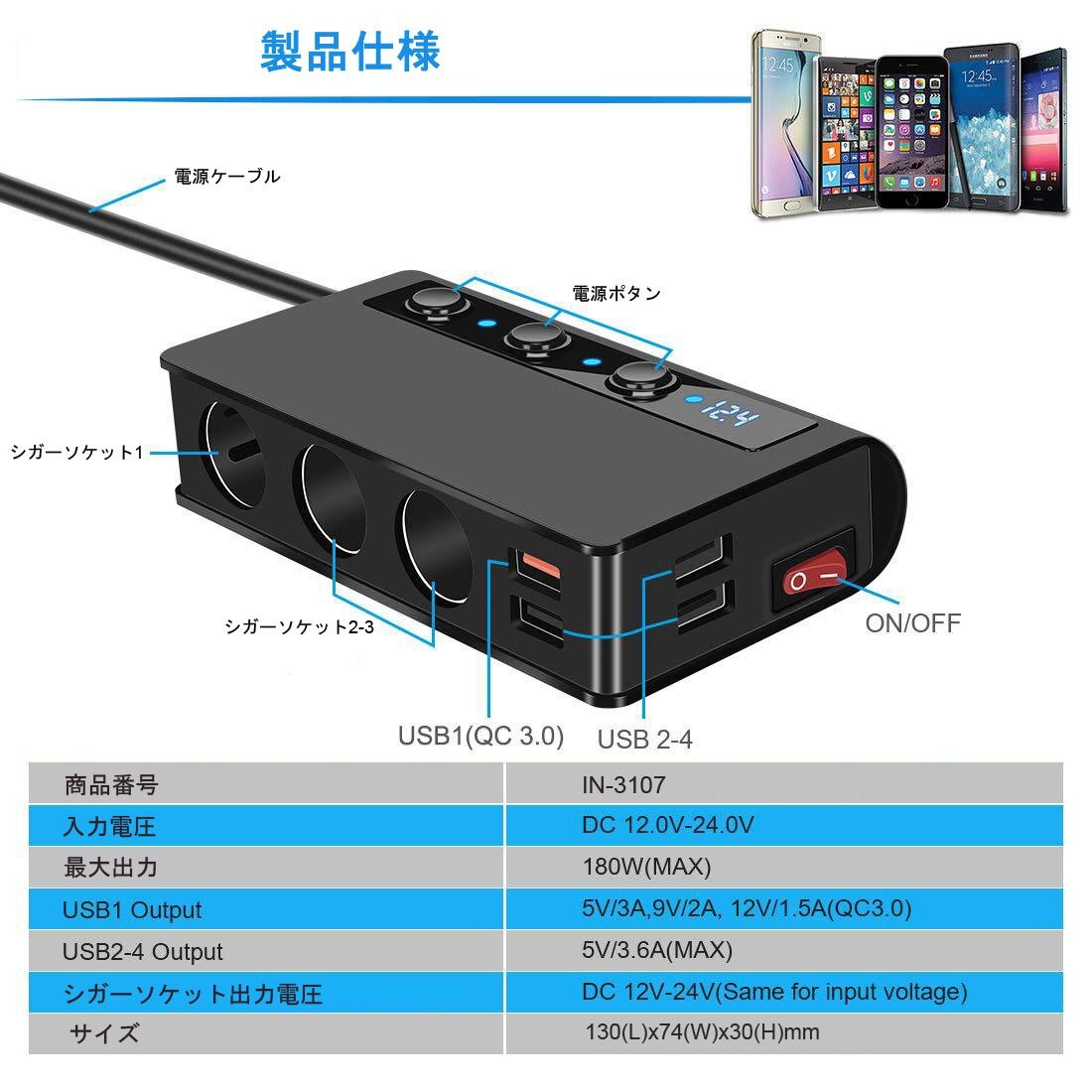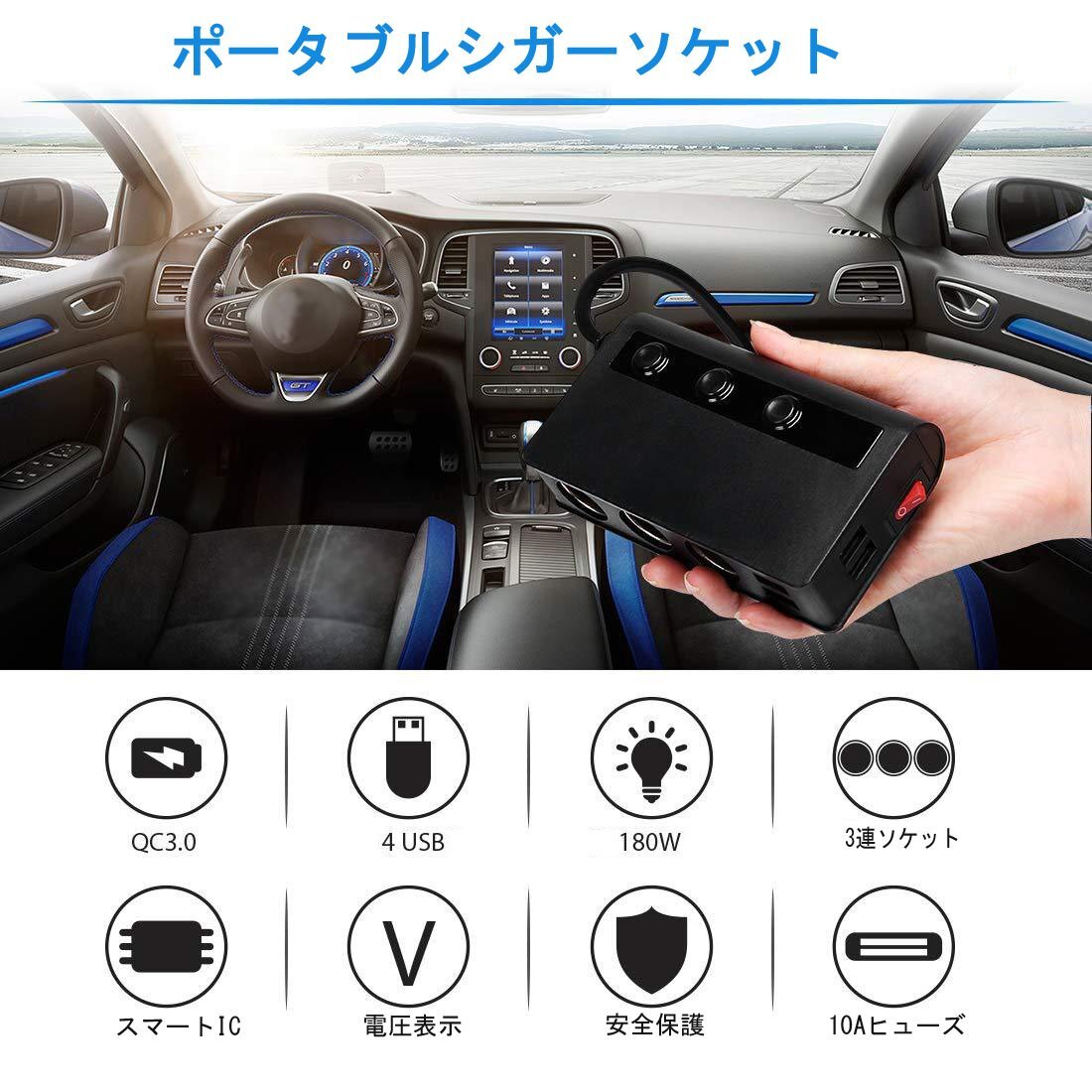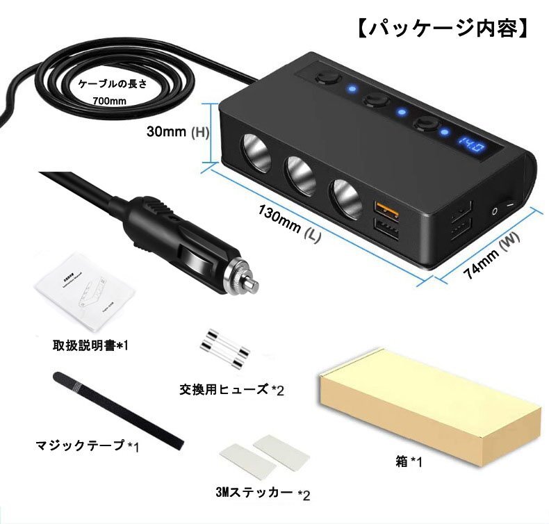 ■商品仕様 商品名:3連シガーソケット 4USBポート 2.4A 入力:DC12-24V ケーブルの長さ:70cm サイズ:130*74*30mm 重量:295g シガーソケット出力電圧:12-24V 4USBポート出力:USB1:QC3.0、USB2-4:合計工率3.6A、各ポート最大2.4 A (最大出力6.6A) 3連ソケット出力:合計電力180W(最大) 安全ヒューズ:10A カラー:ブラック 素材:PC防火材料+高温難燃性ABS樹脂材料 世界品質基準認証:RoHS、CE、FCC認証取得 【 付属品 】 3連シガーソケット本体 交換用ヒューズ 3Mステッカー マジックテープ 取付説明書 ■特徴 過短路、過熱、過負荷、過充電、過電圧、過電流などの6重安全保護機能付き 急速充電QC 3.0搭載増設シガーソケット、最大出力6.6A、((1)QC3.0 (2)2.4A (3)2.1A (4)1A)4口USBポート搭載 最大180W&シガーライター機能付 10.5Vを下回る&14.6Vを上回る場合では、LEDライトが点滅し警告フラッシュ機能付 自動電圧検出用スマートICチップ搭載 スマートフォン程度コンパクト&軽量で持ち運びしやすい洗練されたデザイン設計仕上 PC防火材料で堅牢なアルミ製ボディ設計