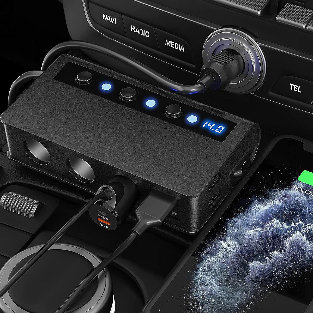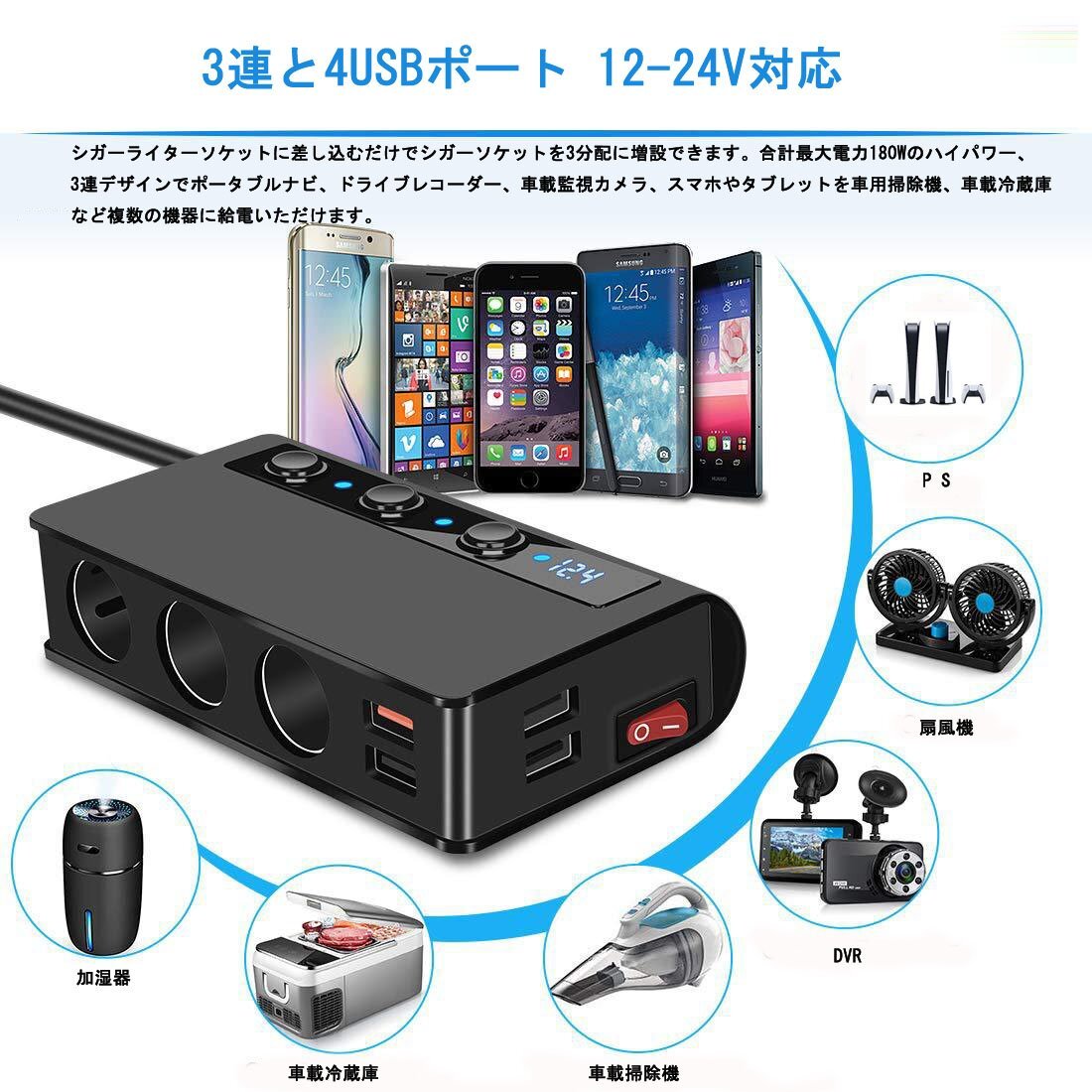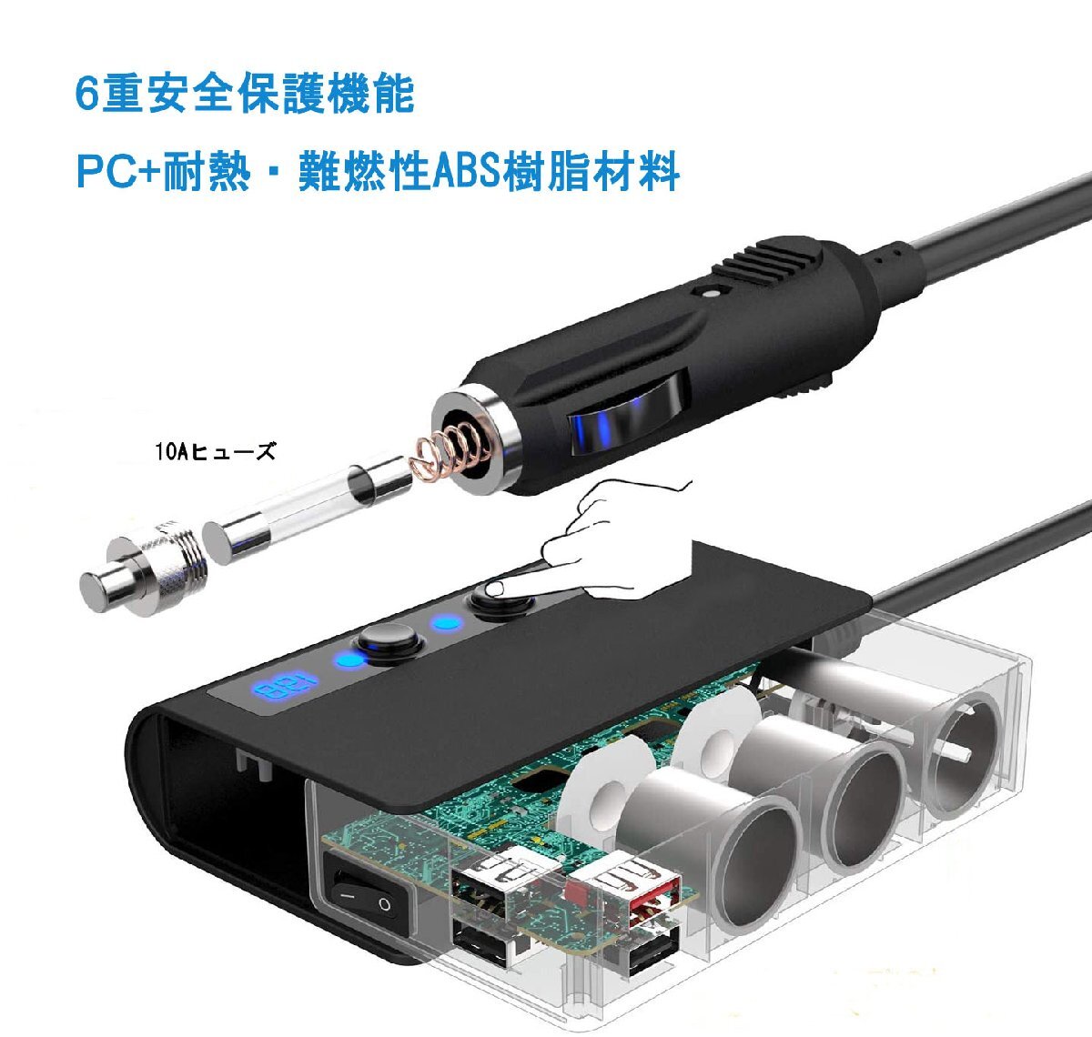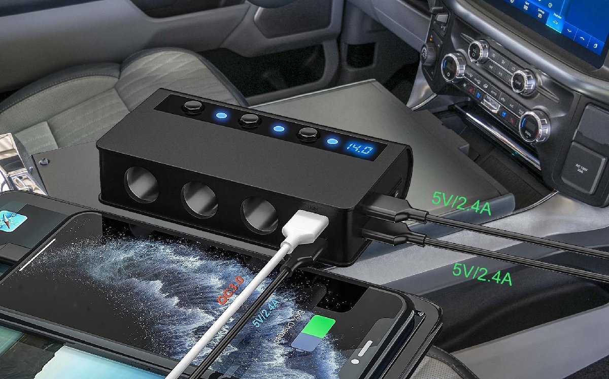 ■商品仕様 商品名:3連シガーソケット 4USBポート 2.4A 入力:DC12-24V ケーブルの長さ:70cm サイズ:130*74*30mm 重量:295g シガーソケット出力電圧:12-24V 4USBポート出力:USB1:QC3.0、USB2-4:合計工率3.6A、各ポート最大2.4 A (最大出力6.6A) 3連ソケット出力:合計電力180W(最大) 安全ヒューズ:10A カラー:ブラック 素材:PC防火材料+高温難燃性ABS樹脂材料 世界品質基準認証:RoHS、CE、FCC認証取得 【 付属品 】 3連シガーソケット本体 交換用ヒューズ 3Mステッカー マジックテープ 取付説明書 ■特徴 過短路、過熱、過負荷、過充電、過電圧、過電流などの6重安全保護機能付き 急速充電QC 3.0搭載増設シガーソケット、最大出力6.6A、((1)QC3.0 (2)2.4A (3)2.1A (4)1A)4口USBポート搭載 最大180W&シガーライター機能付 10.5Vを下回る&14.6Vを上回る場合では、LEDライトが点滅し警告フラッシュ機能付 自動電圧検出用スマートICチップ搭載 スマートフォン程度コンパクト&軽量で持ち運びしやすい洗練されたデザイン設計仕上 PC防火材料で堅牢なアルミ製ボディ設計