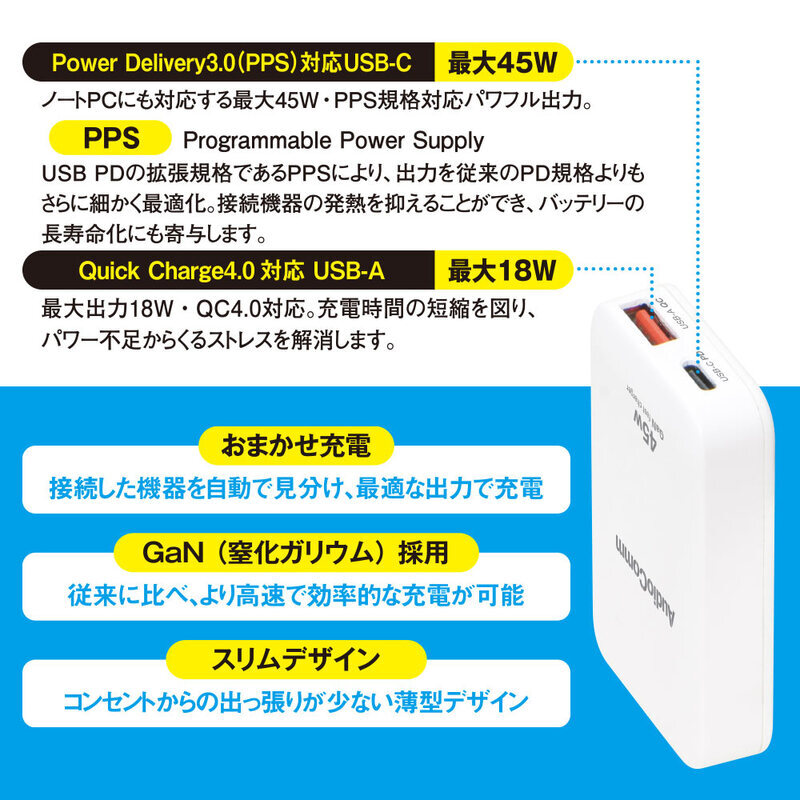※ USB PDまたQuick Chargeの性能を発揮させるには、接続する機器及び接続コードがそれぞれの規格に対応している必要があります。PPSはPPS対応機器のみ有効です。