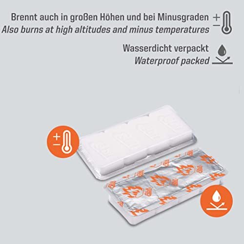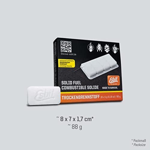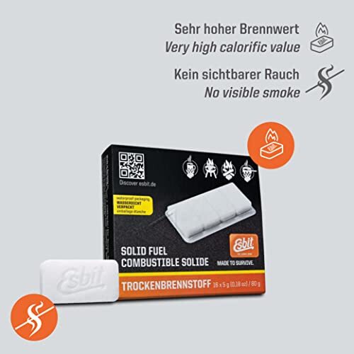 「エスビット(Esbit) アウトドア キャンプ 固形燃料 5gX16 (5g×16タブレット入り) ES00101600」▼4021684000120▼(商品説明)固形燃料 5g×16個入り・ E-FUEL-16X5・・Style:固形燃料 5g×16個入り・発売年・モデルイヤー:2018・スポーツタイプ:アウトドアライフスタイル・燃焼時間:6分(1タブレットあたり)・内容:1箱5g×16タブレット入り4タブレットづつ完全防湿ブリスターパック。・特徴1:揮発性なし。燃焼時液体化なし。スパークなし。燃え残りほとんどなし。目に見える煙なし。説明 ●エスビットの固形燃料5gは16タブレット入りで、4タブレットづつ完全防湿ブリスターパックとなっています。●標高の高い場所や氷点下でも安定した炎で燃え、目に見える煙は立てず燃えかすをほとんど残しません。●固形燃料は汎用性が高く、食事や飲み物を加熱したり、キャンプファイアやバーベキューの火おこしなどにも最適です。●5gの燃焼時間は1タブレットあたり約6分です。●火力は1タブレットあたり35kcal