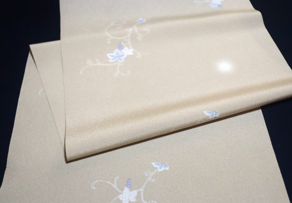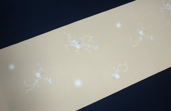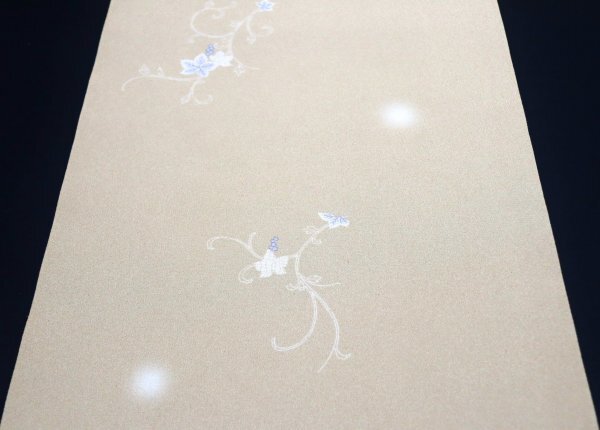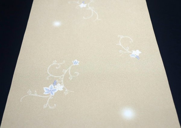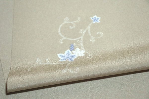| 【京わぎれ】東レ シルック ちりめん小紋 はぎれ ホタルぼかしにブドウ唐草文様 薄白茶色(きなり色)地 約5m ② | ||||