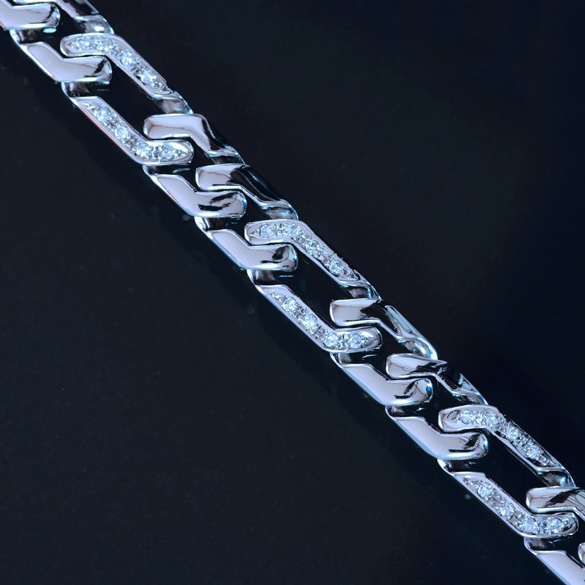 ど定番すぎる喜平とは違う、デザイン性あるチェーンに天然ダイヤモンドをセットしたブレスレットでございます。もちろんプラチナのズシリとした重量感も心地よいセレブリティジュエリーです♪ノーブルジェムグレーディングラボラトリーの鑑別書付。新品仕上済。