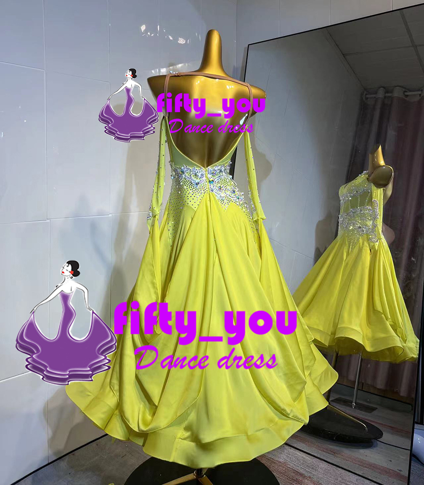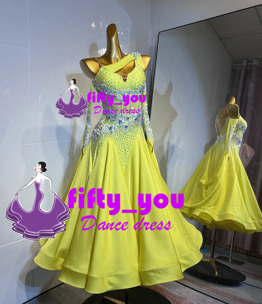 新品fifty_you レディース社交ダンス衣装 モダン競技ドレス セミオーダー  モチーフ+ライトストーン飾り  スタンダードドレス 黄色