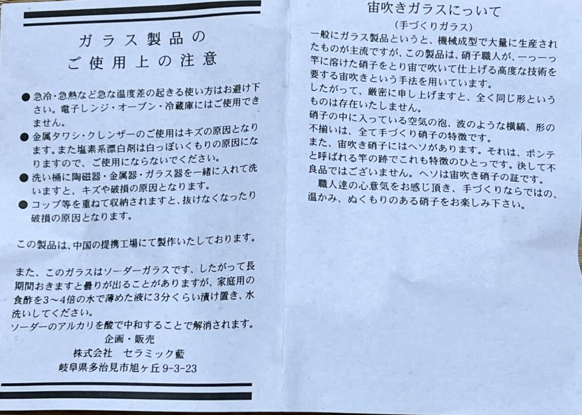 硝子の中に入っている空気の泡、波のような横縞、形の 不揃いは、全て手づくり硝子の特徴です。