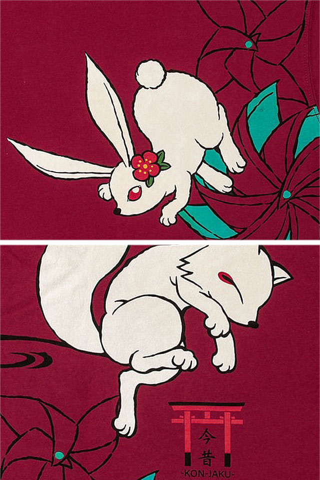 愛らしい狐のキャラクターが主役の【今昔】から「風車に兎」半袖Tシャツ(KJ-27002)のご紹介です。 久しぶりに新たな仲間の登場です! 耳の花飾りがキュートなうさぎちゃん。 風に吹かれる風車の間を飛び回るこんぎつねとうさちゃんが本当に可愛らしいデザインのTシャツです。 今回は色味を抑えシックな感じに仕上げました。 ボディーには軽い着心地の綿生地を採用。 | |||||||||||||||||||||||||