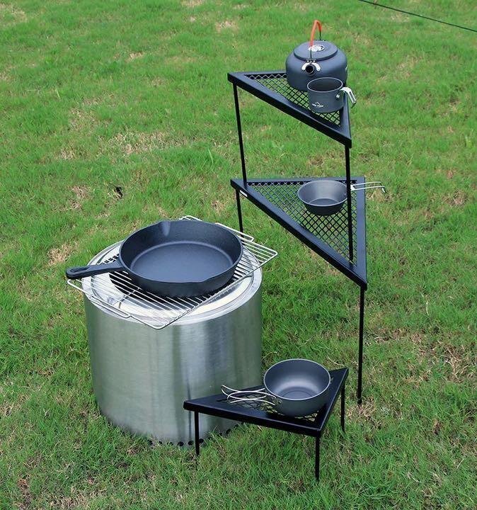 ★天板や脚の素材は100%鉄で出来ており、直火にかけて使用できるのが大きなメリットです。三角形の天板部分は必要十分な形状で、五徳として使う時に大き過ぎ ず小さ過ぎずの抜群のサイズ感と使い勝手です。脚部分は細いながらもしっかりしていてぐらつきもなく、重い鍋やフライパンも安心して置けます。