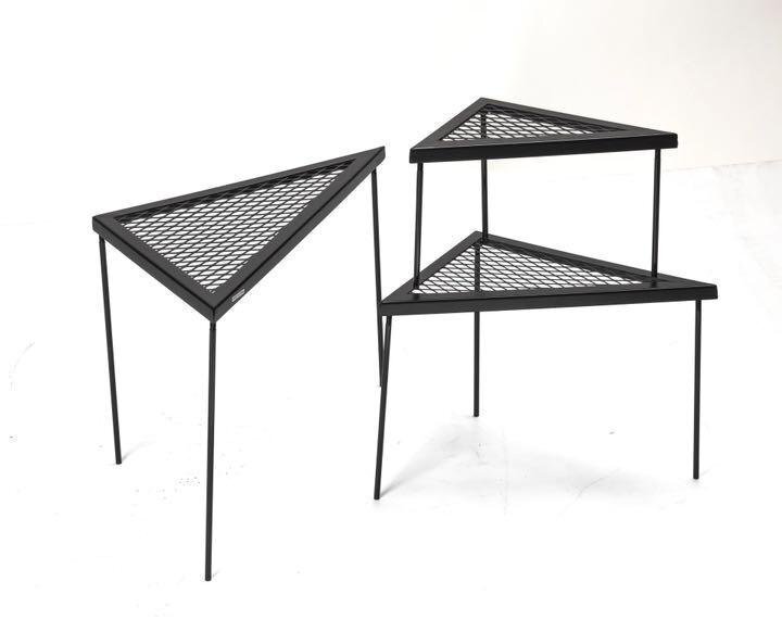 ★こちらは大きさが異なる3つの三角形のテーブル3点と、3段階の高さが変更できる取り外し可能な3サイズの鉄脚3本づつ付属しています。大中小3種類のテーブ ルと脚がケースに綺麗に収まっており、一枚板のようにスッキリと収納できます。