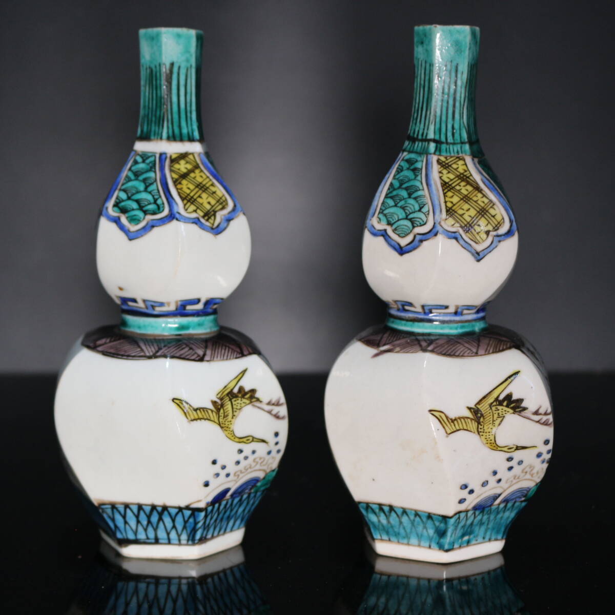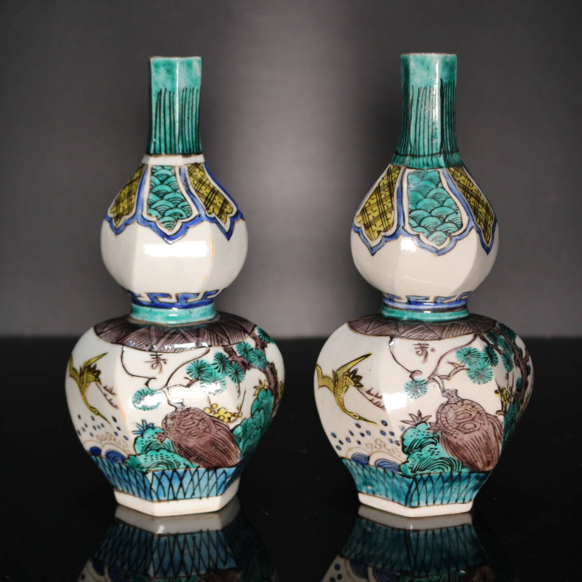 古九谷 / 徳利 / 一対 / 九谷焼 / 六角瓢徳利 / 松鶴文 / 色絵 / 酒器 / 酒注 / 酒瓶 / 陶器 / 焼き物 / 時代物 / 骨董 / 古美術 でございます。
