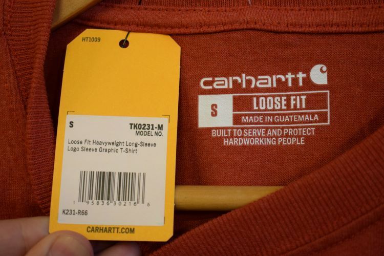 デッドストック品◎新品未使用CARHARTTカーハート袖プリントコットン&ポリエステル長袖TシャツSオレンジ系アメカジストリートワークh24188
