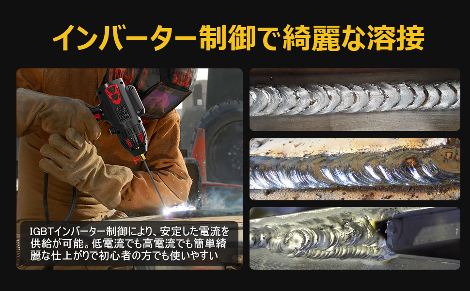【最先端IGBTインバーター制御】アーク溶接機は最先端なIGBTインバータ制御を採用し、出力電流がスムーズに制御され、低電流でも高電流でもアークが安定になり、スパッタも少なくて、キレイな仕上がりが得られ、溶接品質が向上!それに、インバータ制御技術により、軽量化と出力・使用率の大幅アップを実現しました。持ち運びにもラクラク!
