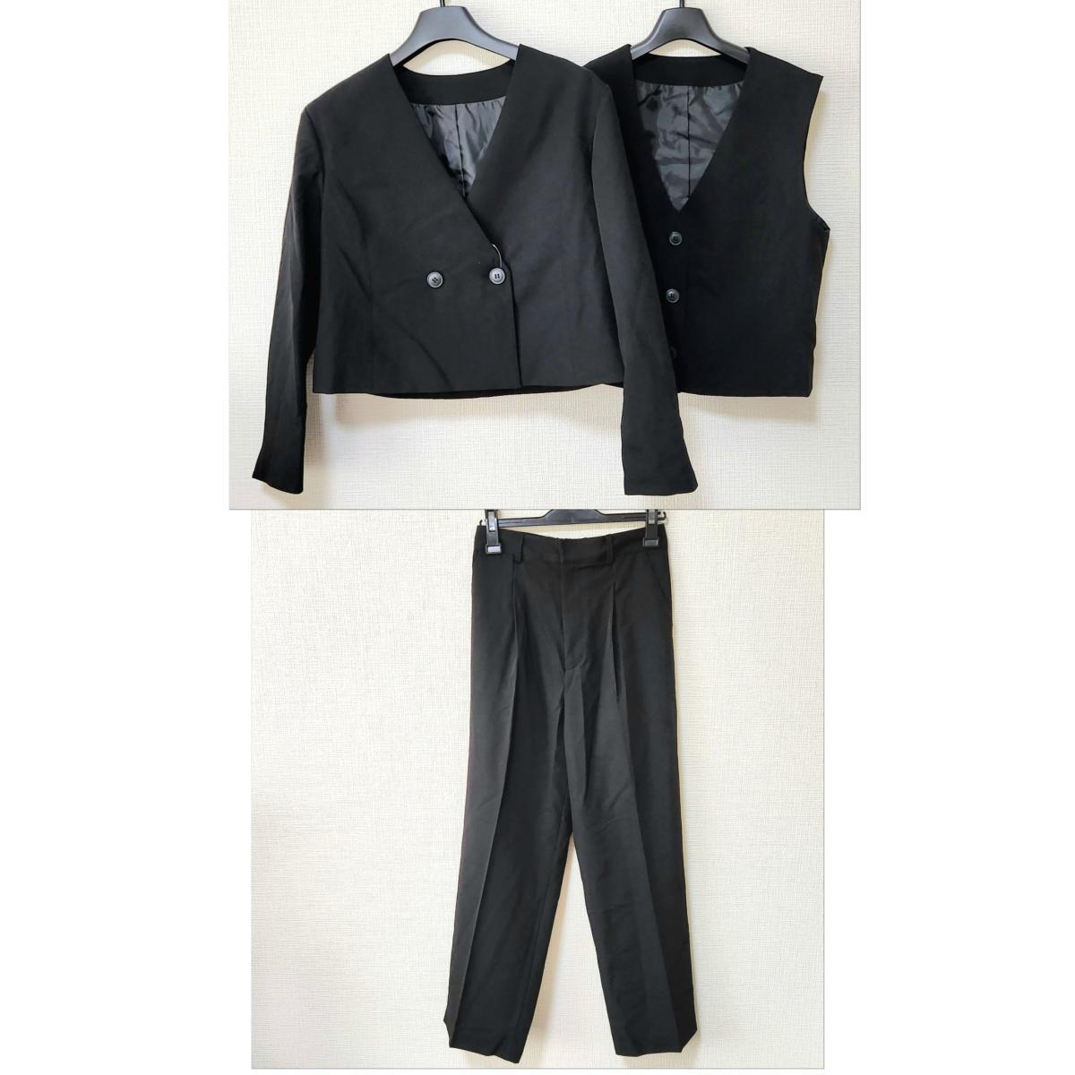 ダブルのノーカラージャケット、ベスト、パンツの3点セットです