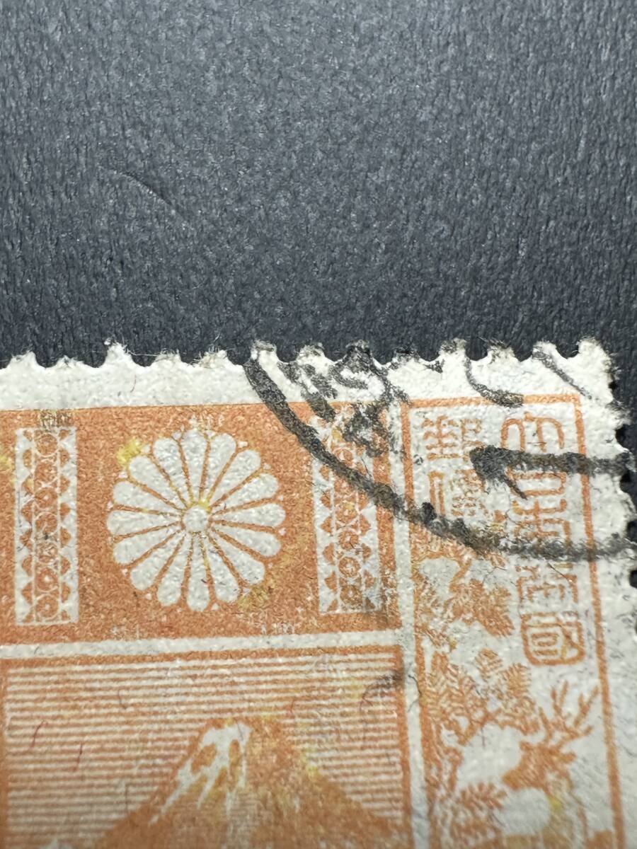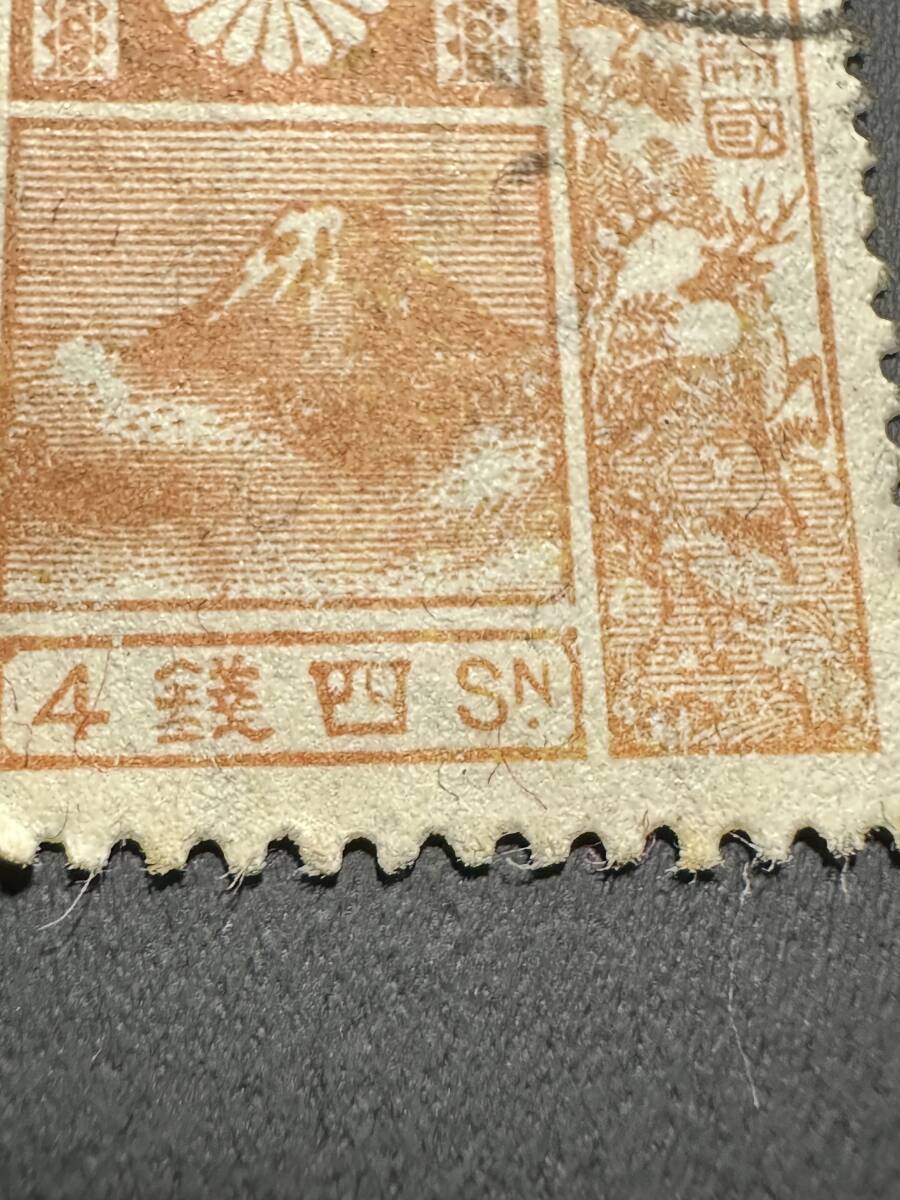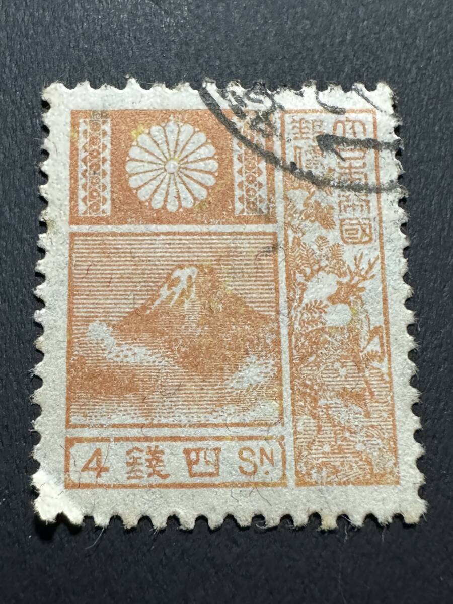 サイズ 縦:約2.6㎝ 横:約2.2㎝ カラー:橙色他 大変希少でデザイン性満載の使用済 消印付 大日本帝国郵便 新版改色 富士鹿切手 4銭で、コレクションにおすすめの一品です。 |