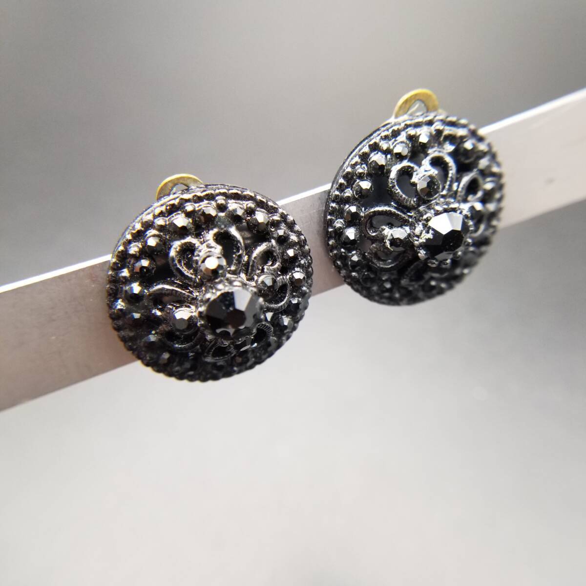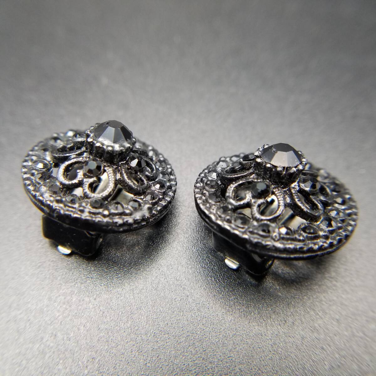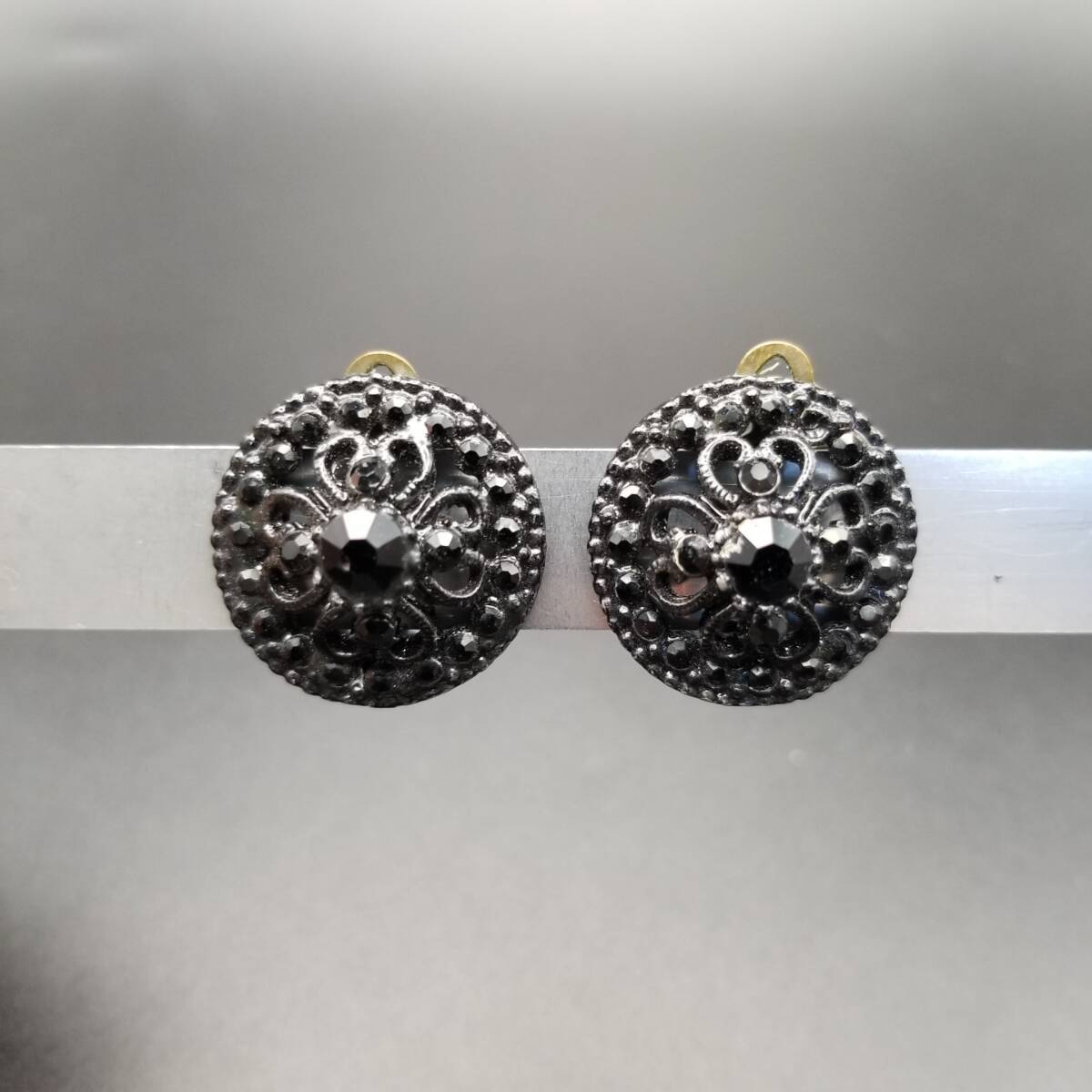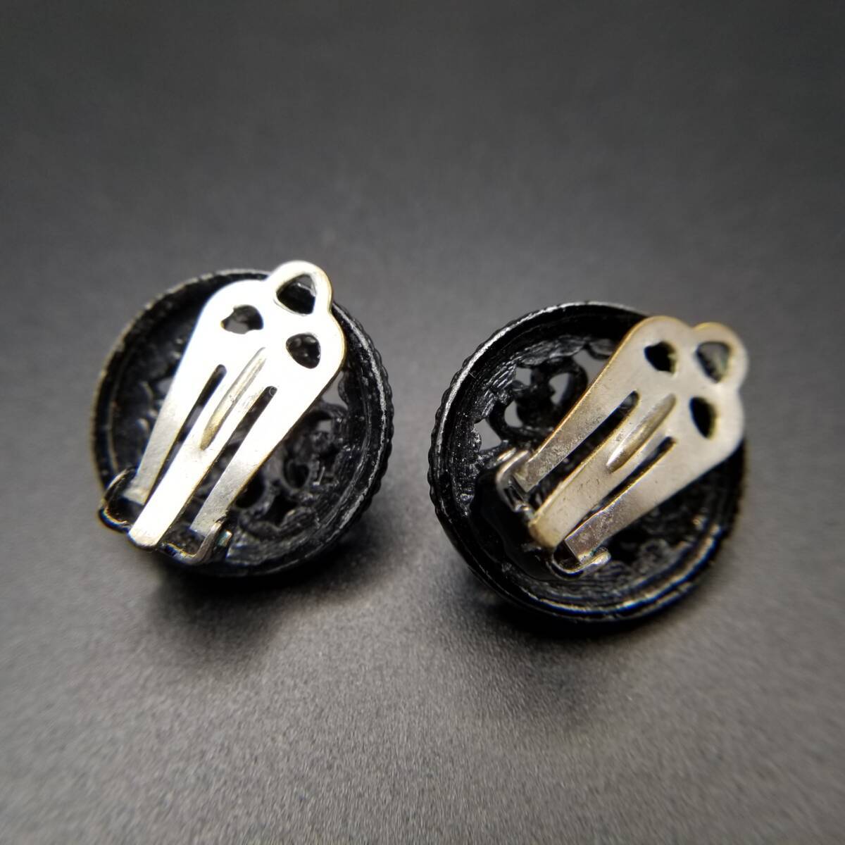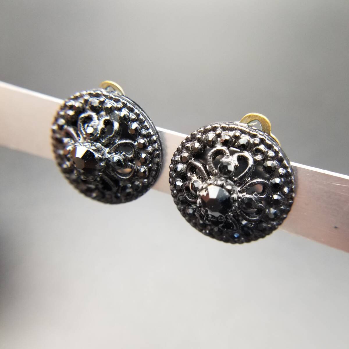 ブラックレース装飾 ラウンド 透かし ヴィンテージ フラワー クリップイヤリング クラシカル 上品 黒 小ぶり Y18-D