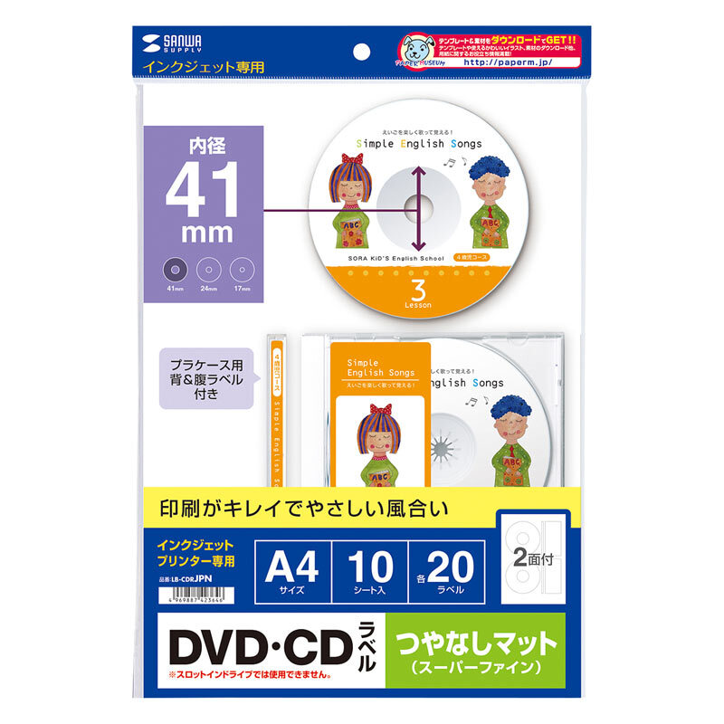 ●オリジナルのDVD・CDを美しく完成させるオリジナルラベルがインクジェットプリンターで手軽に作れます。標準サイズの内径41mmタイプです。