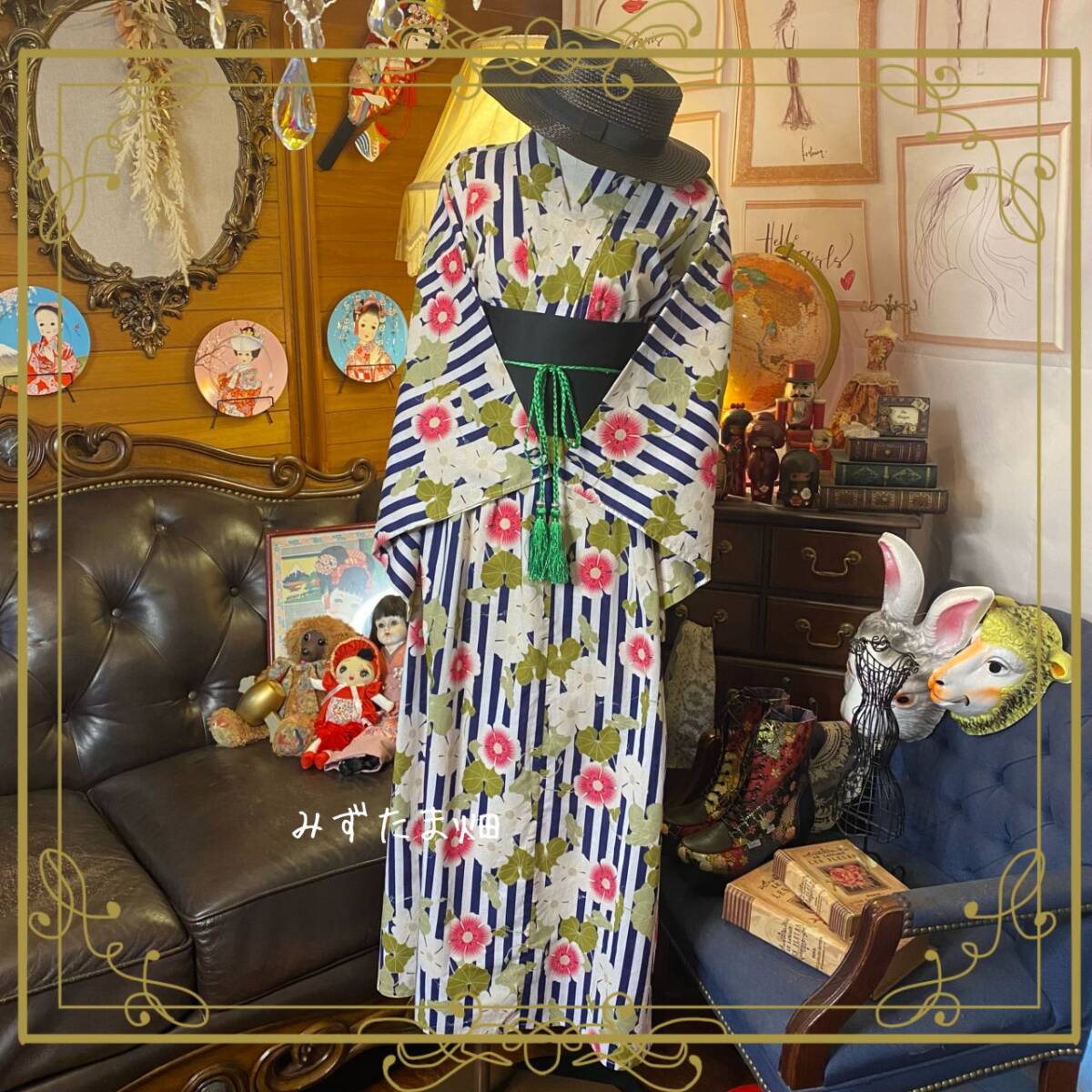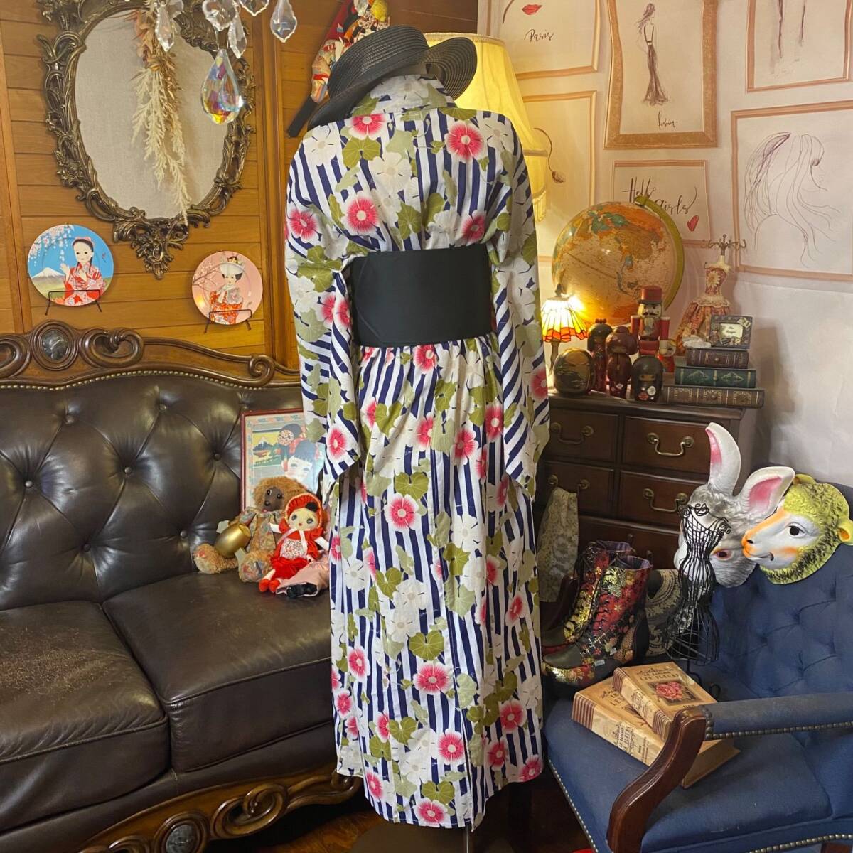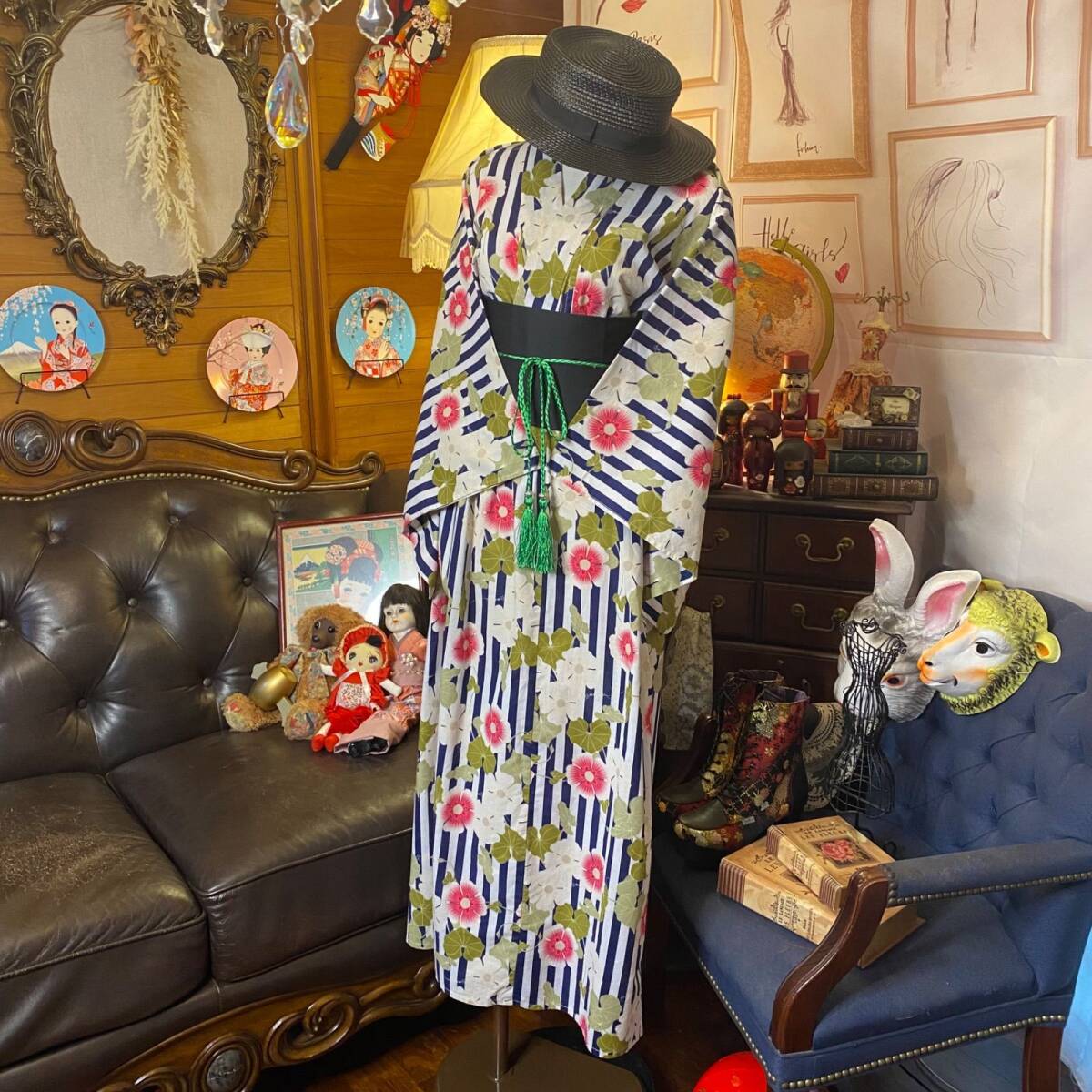 【 和洋折衷 浴衣 リメイク ロング丈 ワンピース ドレス 帯サッシュベルト 素敵なお花とストライプ W-469 】