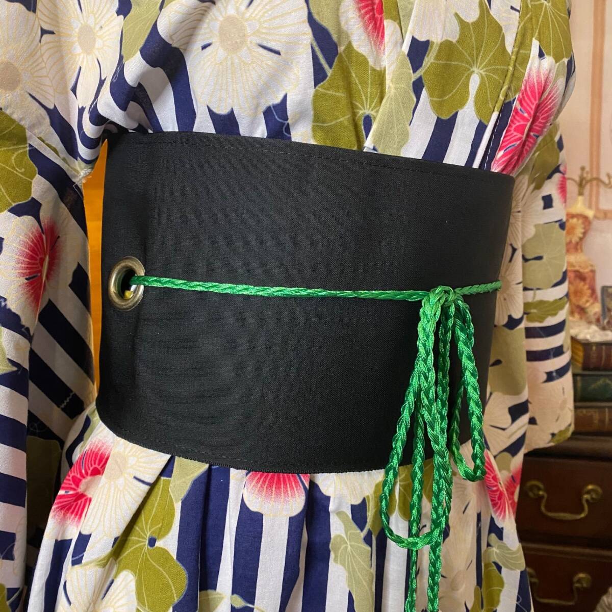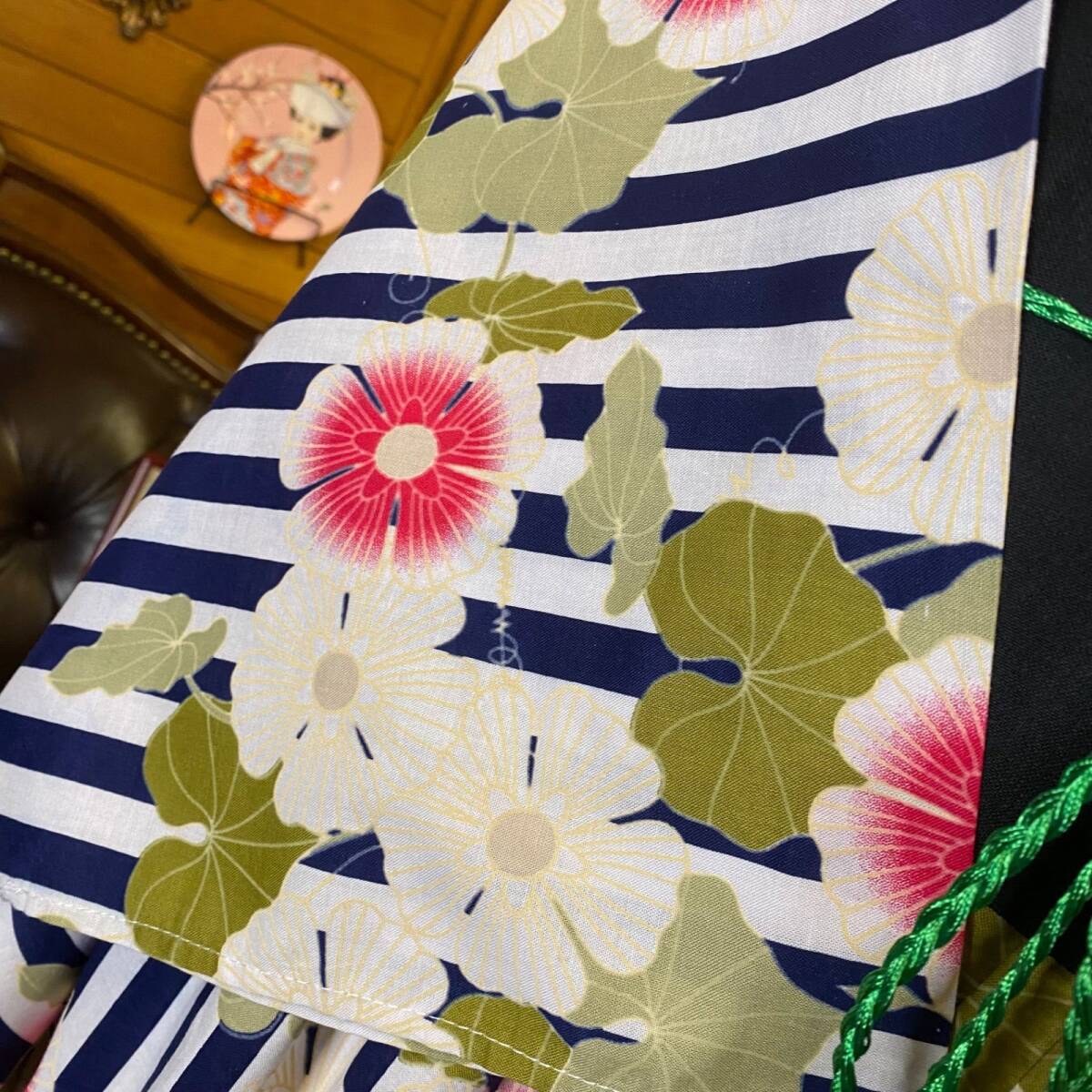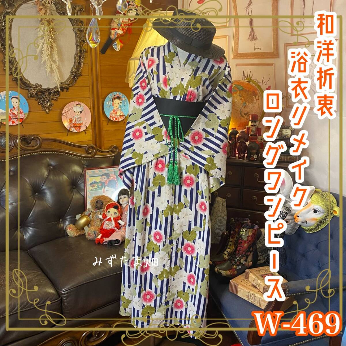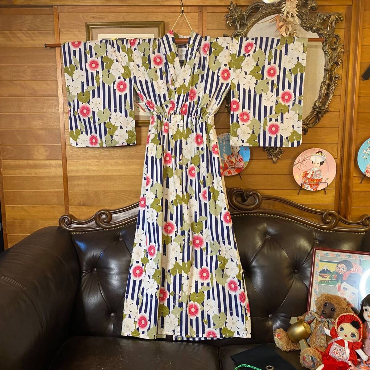 【 和洋折衷 浴衣 リメイク ロング丈 ワンピース ドレス 帯サッシュベルト 素敵なお花とストライプ W-469 】