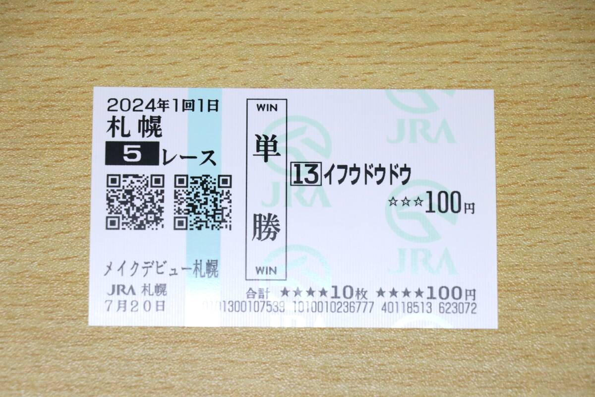 イフウドウドウ メイクデビュー札幌 5R (2024年7/20) 現地単勝馬券(札幌競馬場)です。気に入って頂けた方の落札を心よりお待ちしております。