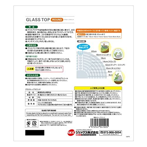 「ジェックス GEX AQUARIUM グラストップラウンド グラスアクア用 金魚鉢 円形水槽 プラフタ」▼4972547041005▼(商品説明)Aquarium・透明 4972547041005・蒸発を抑え、魚の飛び出し防止に グラスアクアや金魚鉢等の円形水槽の開口部に乗せて、水の蒸発を抑え、魚の飛び出しを防止するプラスチックフタです。湿度が維持でき、コケリウムにも最適。お持ちの水槽サイズに合わせ、スリットに沿って簡に切り取って使用できます。光を通すクリアタイプ。メンテナンスしやすい取っ手付き。コードを通す隙間も作れて使いやすい!・【適合サイズ】開口部の外径20cmまで。・【切断時サイズ】約18cm(シリンダー)、16cm、14cm(ドロップ)、12cm(ティアー・スフィア)、10cm(キャンドル)、8cm、6cm。・【切り取り方法】本製品ははさみやカッター等では切り取りにくいため、市販のニッパー等で、切り残しがないように注意しながら切り取ってください。※切り取る際に手等をケガしないよう充分ご注意ください。・【使用上の注意】本製品を切り離した切断面は鋭利になることがありますので、その場合は断面をやすり等で調整してください。本製品は開口部が斜めのものや、円形でないものには使用できません。水垢や汚れは定期的に