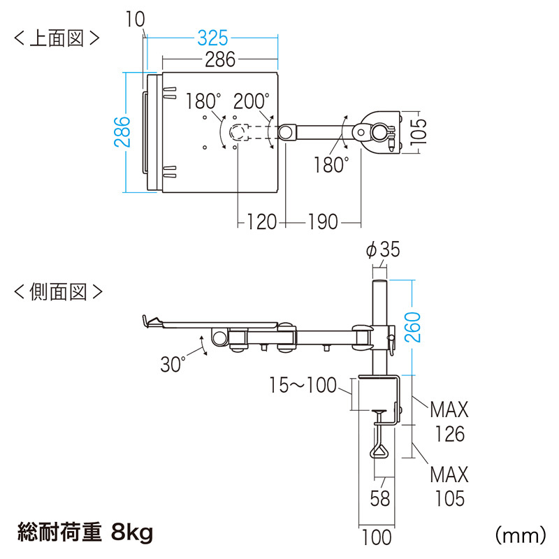 ●デスクへの取付けはクランプ式になっており、厚さ15~100mmの天板に取付けることができます。