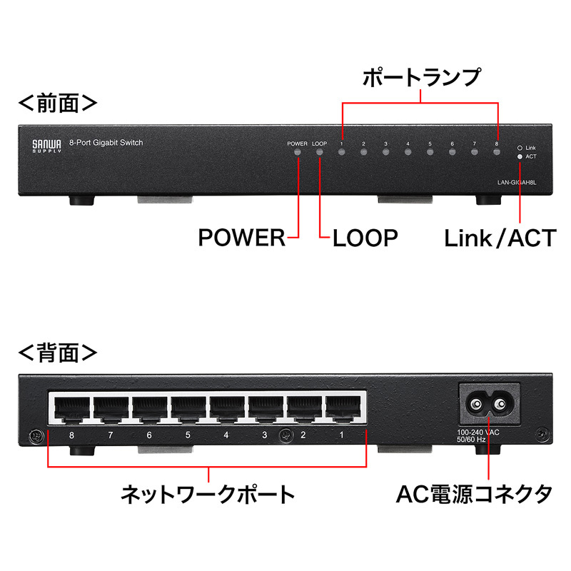 Giga対応スイッチングハブ。8ポート・ループ検知機能付き。