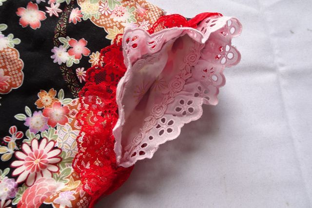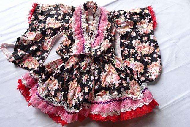 首ぐり、袖口、スカート裾はフリル、レース装飾付きです。