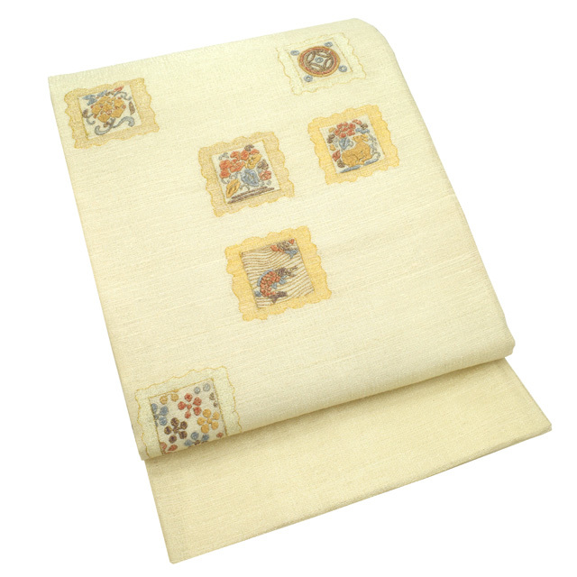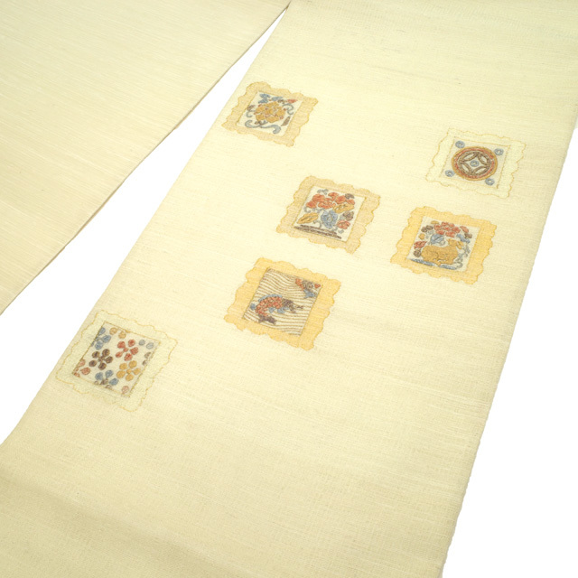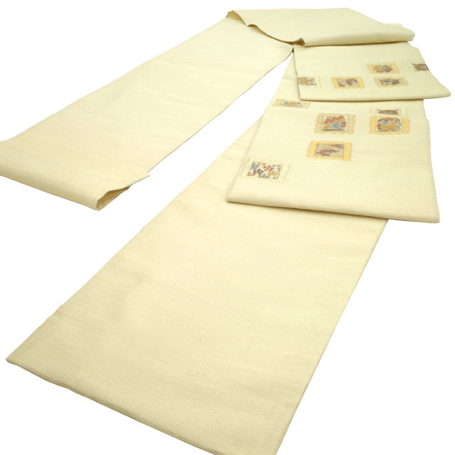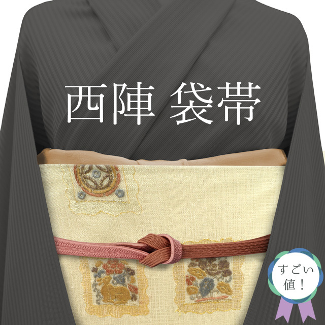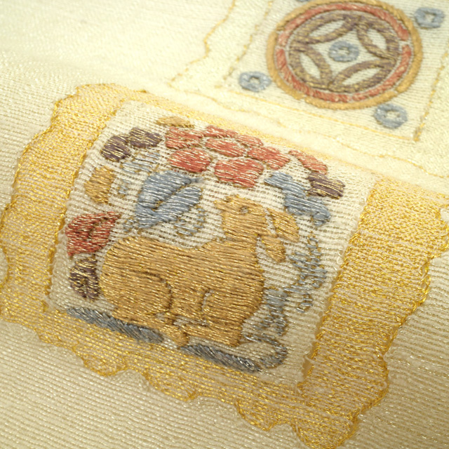 【中古】 すごい値! 袋帯 リサイクル フォーマル 京都 西陣 正絹 アイボリー 花兎 花唐草 丸文 金糸 お太鼓柄 仕立て上がり 春 秋 冬 結婚式 お茶会 入学式 卒業式 七五三 お祝い パーティー などのフォーマルな場面に 販売 購入 綺麗 美品 たとう紙付き 送料無料 リユース すごいね みやがわ neb01169