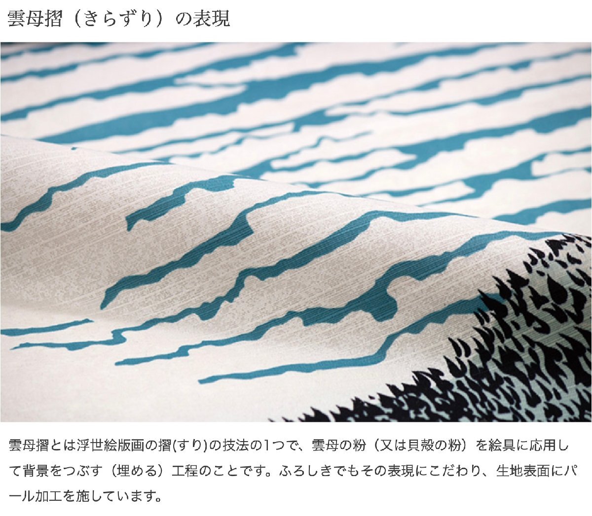 文化的な絵画様式を保つ一方、人々の日常生活や風物などを多く描いてきた浮世絵。 日本を代表する浮世絵師、葛飾北斎が富士山を主題として描いた富嶽三十六景の中で代表的な2つの作品が104cmサイズの大きなふろしきになりました。 水しぶきや雲の部分にさりげなくパール加工を施しており、大胆かつ繊細な仕上がりとなっています。 タペストリーやテーブルクロスなど装飾用としてはもちろん、バッグとして持ったり大きなギフト、衣類を包むのにご活用いただけます。 お土産にもおすすめです。