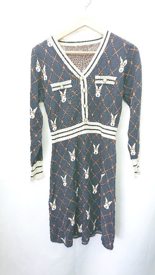 ◇ ノーブランド 総柄 長袖 ロング丈 ワンピース サイズ表記なし ネイビー レディース E