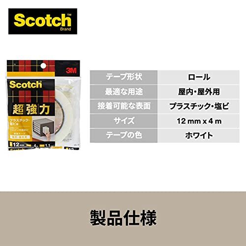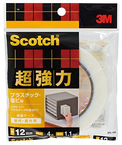 「3M 両面テープ 超強力 プラスチック 塩ビ 用 幅12mm 長さ4m スコッチ SPL-12R セミロング」▼4550309285036▼(商品説明)新モデル・4. プラスチック・塩ビ用 c. 幅12ミリ長さ4.0メートル SPL-12R・・Color:4. プラスチック・塩ビ用Size:c. 幅12ミリ長さ4.0メートル・スリーエム スコッチ 超強力両面テープ プラスチック・塩ビ用 幅12mm長さ1.5m SPL-12R・基材:アクリルフォーム 粘着剤:アクリル系・サイズ(厚みx幅x長さ):1.14mmx12mmx4m・使用温度範囲:-20~90℃・屋内・屋外用説明 これ1個で幅広い種類のプラスチックどうしをしっかり接着! 裏面の製品説明をよく読んでご使用ください。