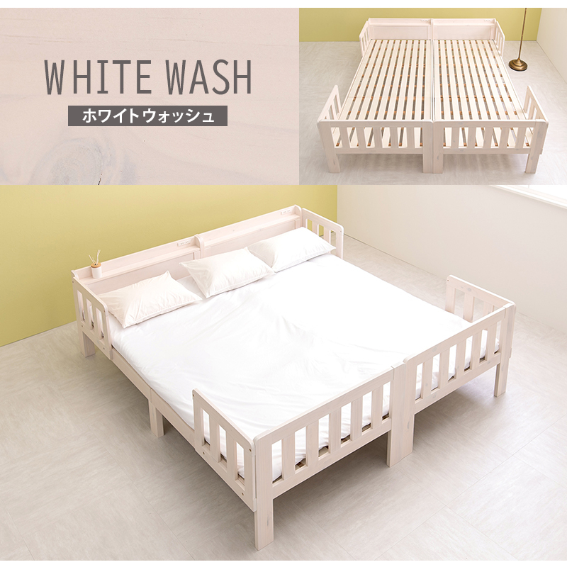1台だとベッドガード付きの1人用ベッド、2台を連結すると家族で広々使える大きなキングサイズベッドに。