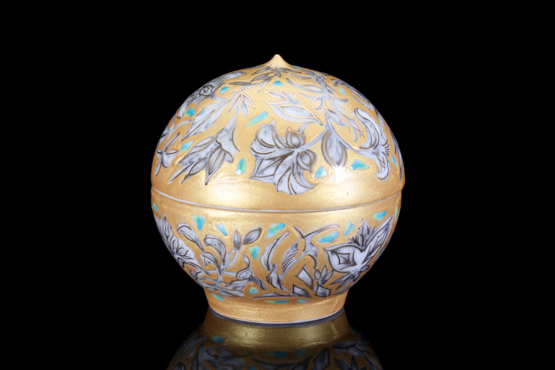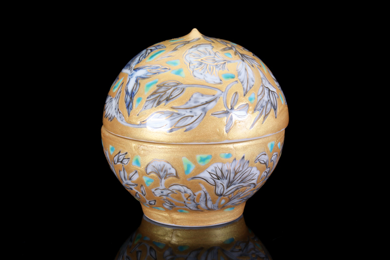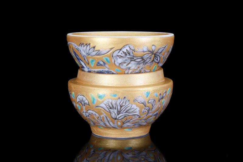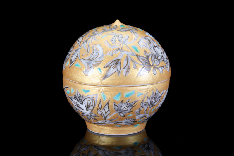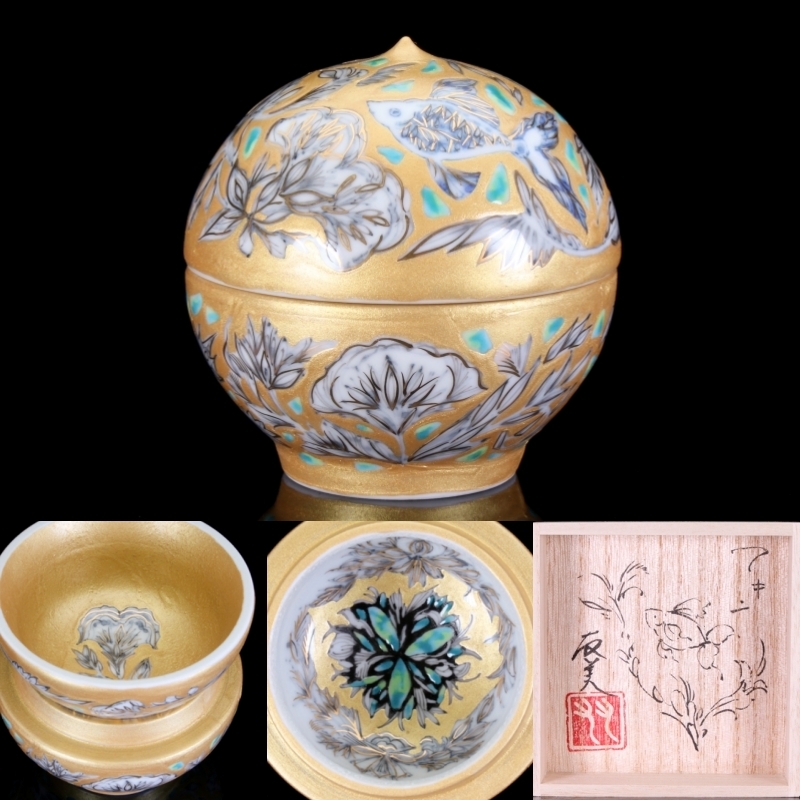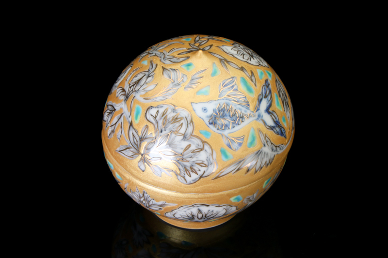 見所 様々な動植物をモチーフにした美しく幻想的な絵付で私たちを魅了する九谷焼作家。金銀彩が上品にあしらわれた爽やかな色彩感覚と、まるで風が吹いてるかのような繊細かつ流動的な筆使いが織りなす、美しき細密画。凛としたエネルギーと儚さを融合させたカオティックな世界観は、朴木さんならではの唯一無二の絵付表現です。