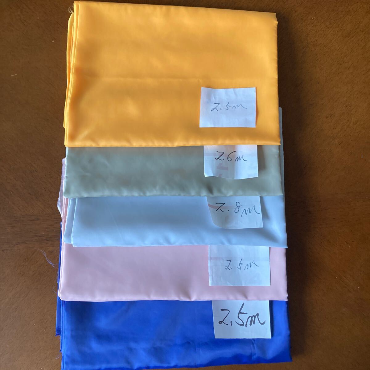 幅はすべて120㎝あります。オレンジ、萌葱色?,淡い灰色,淡いピンク,紺色の5色になります。色合いと長さは映像てお確かめ下さい。