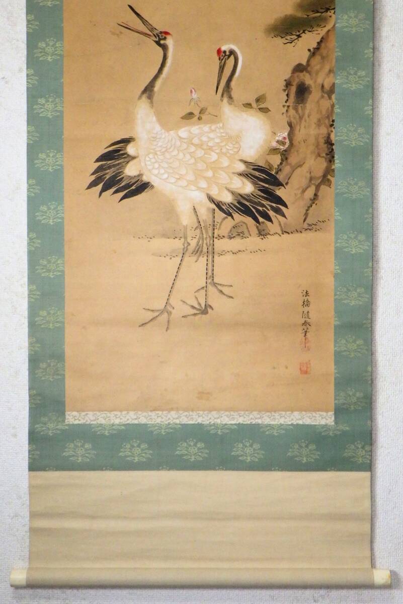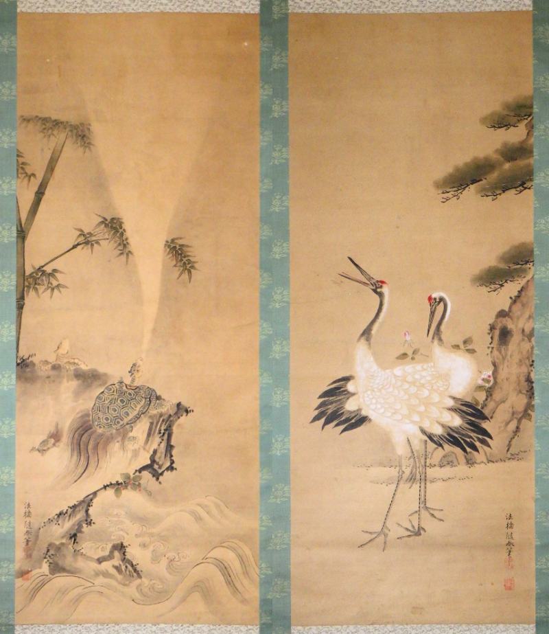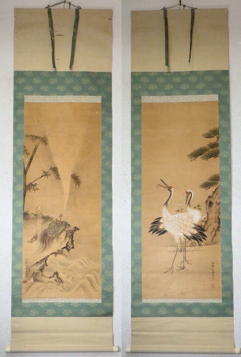 江戸中後期 山陰出雲 竹内甫記 隨春斎 法橋 鶴亀 対幅 肉筆 狩野派 狩野随川門人 出雲松江の人