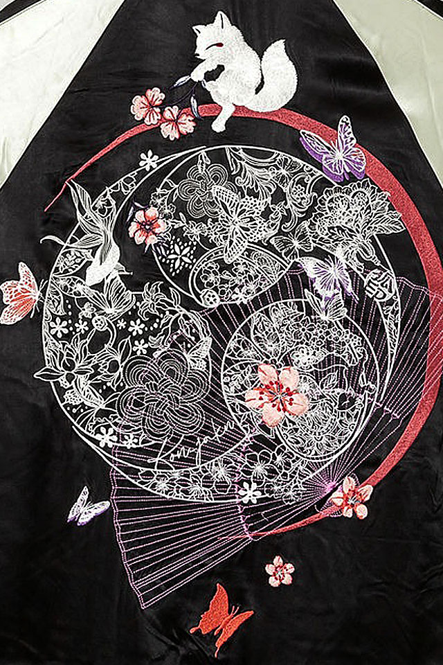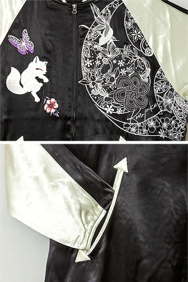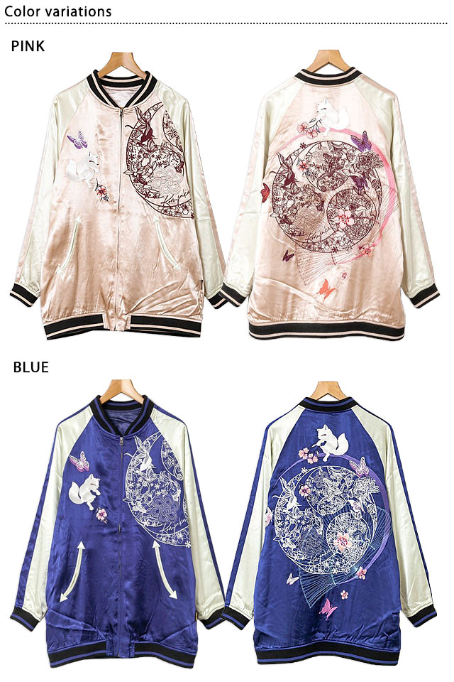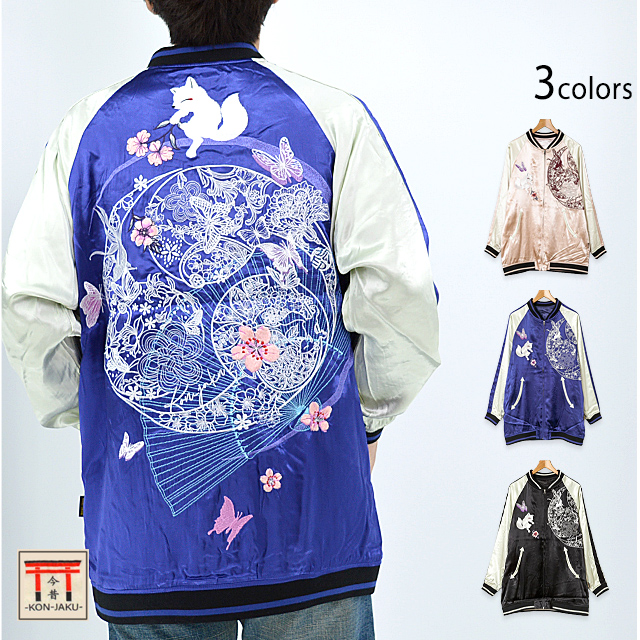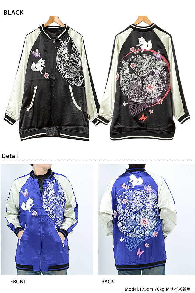 愛らしい狐のキャラクターが主役の【今昔】から「巴BIGスカジャン(KJ-29197)」のご紹介です。 今昔から大きめサイズで着るBIGスカジャンが登場しました! 今回は巴の文様をデザインしたBIGスカジャンです。 ボディーにはレーヨンサテンを採用。 | ||||||||||||