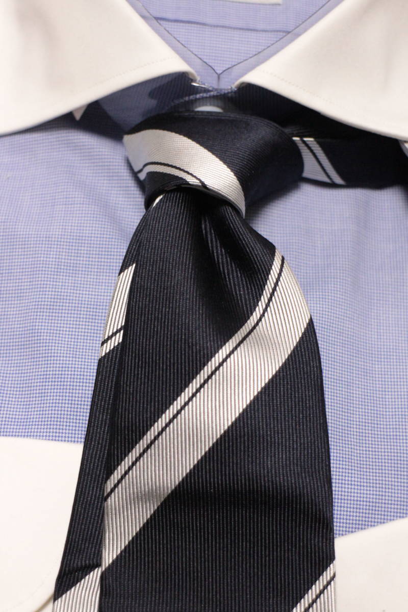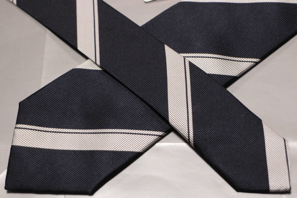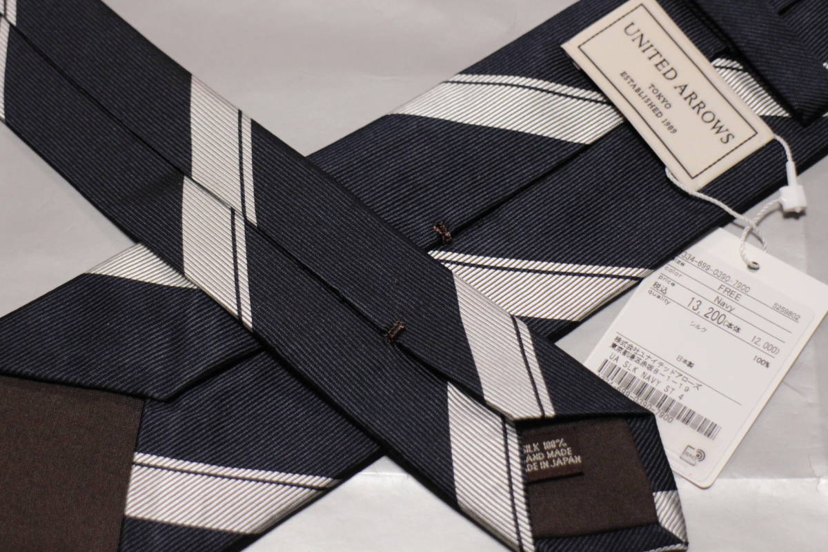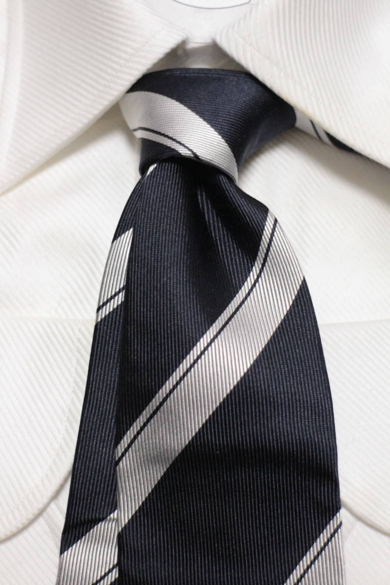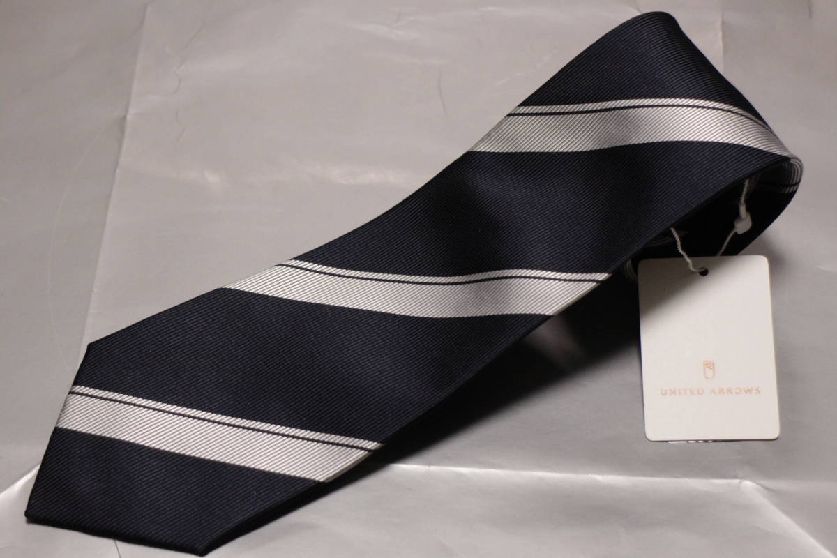 ユナイテッドアローズ新品ネクタイ艶美麗ダークネイビー*シルバーレジメンタル重厚ツイル織バンカーストライプフルハンドメイド大人気柄