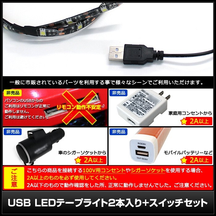 画像でも説明しておりますが、USBを家庭用100V電源に繋ぐ場合や車のシガーソケットを接続して本製品を使用する場合、2A以上対応しているものをご使用ください。 1Aのものでも点灯しますが規定の明るさより暗く発光してしまいます。 | |