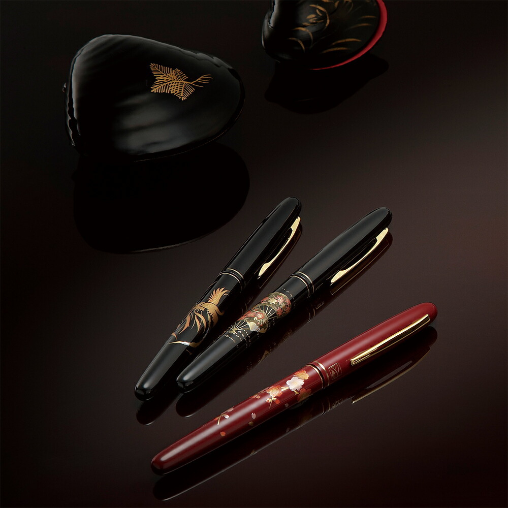 日本の伝統工芸である蒔絵。その美しい模様を現代技術で万年毛筆に再現しました。蒔絵独特の色彩と艶やかさをお届けします。耐久性・復元性に富んだポリエステル毛材を使用。